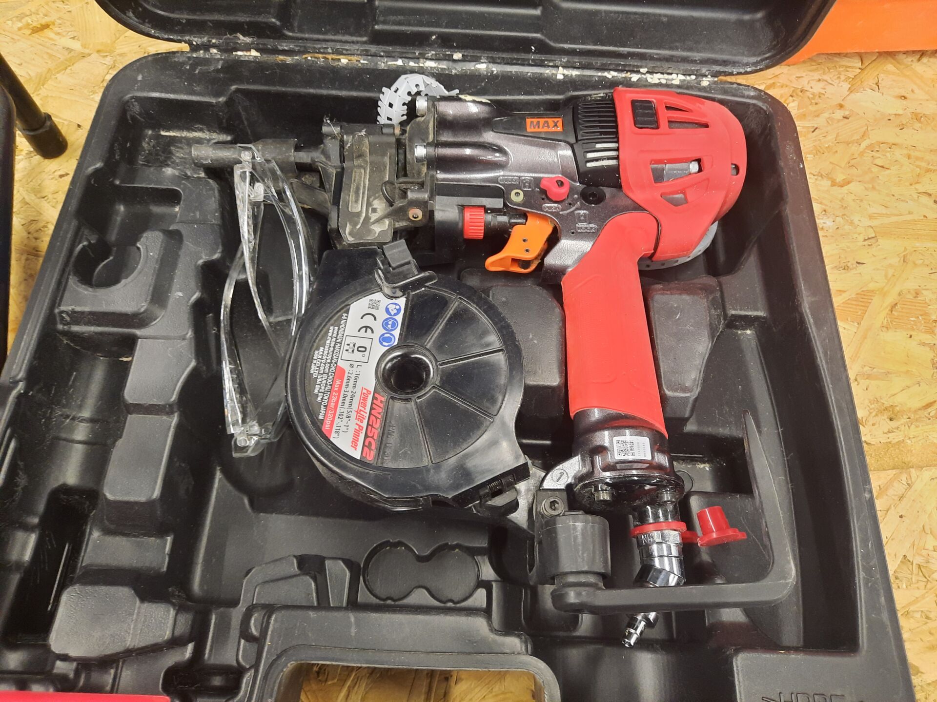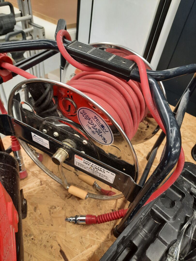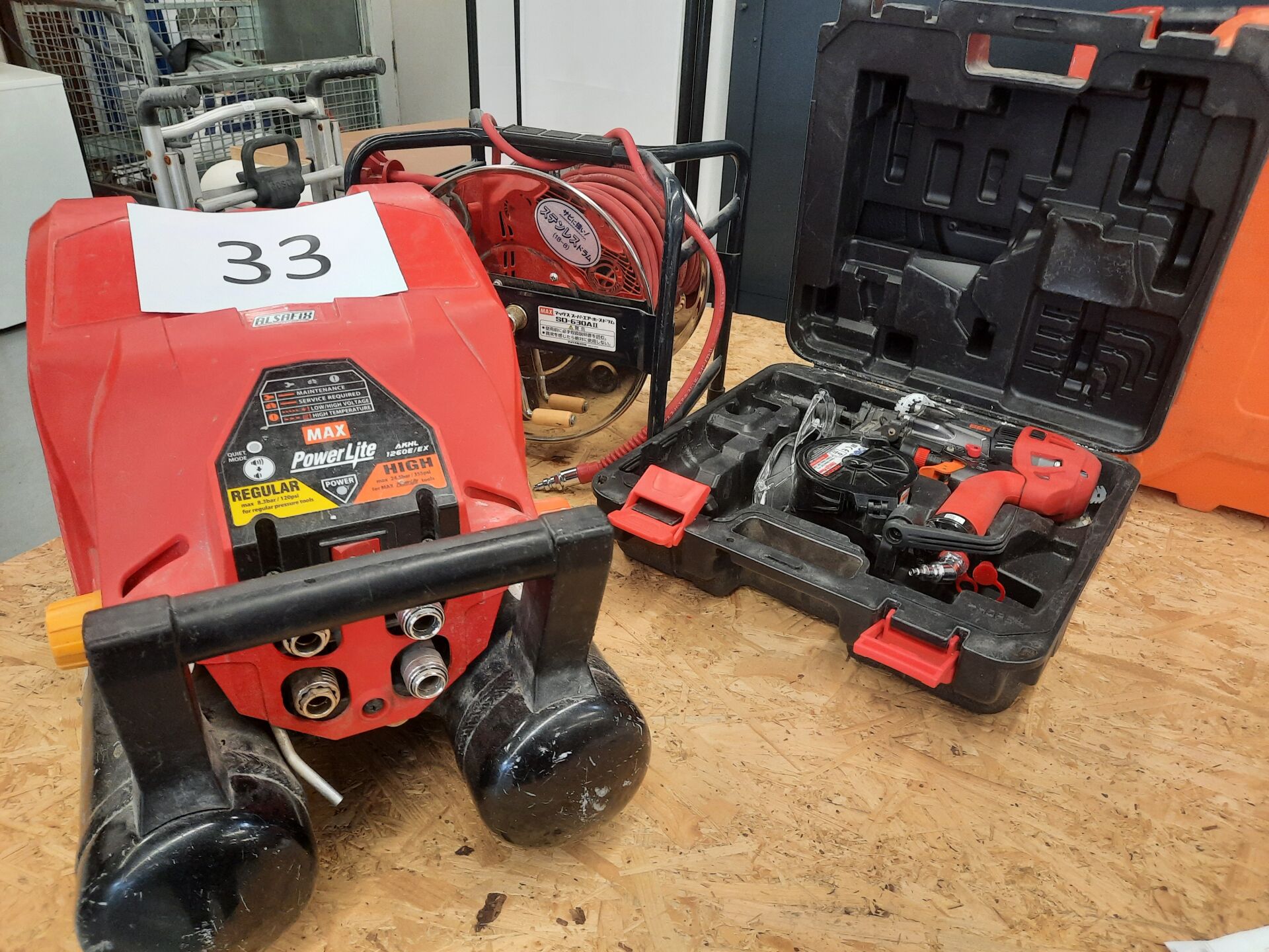 Compresseur haute pression ALSAFIX MAX POWERLITE modèle AKHL 1260 E, 2 sorties dont haute pression 24.5 bar 2 cuves de 4.3L, année 2020 Cloueur pneumatique MAX modèle HN25C2 capacité 24 mm, 23 bar Dévidoir à tuyau d'air MAX modèle SD-630 AII