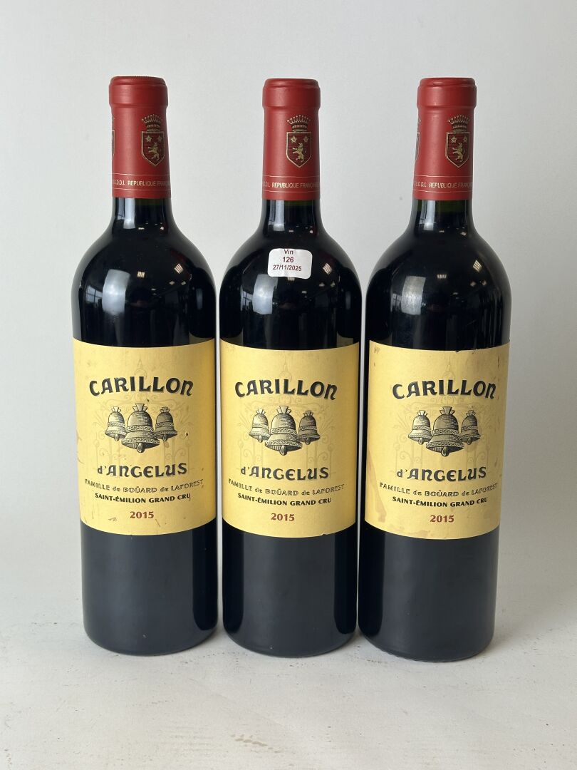 3 bouteilles de Saint Emilion Grand cru - Carillon d'Angelus - Famille de BOUARD de LAFOREST - 2015.