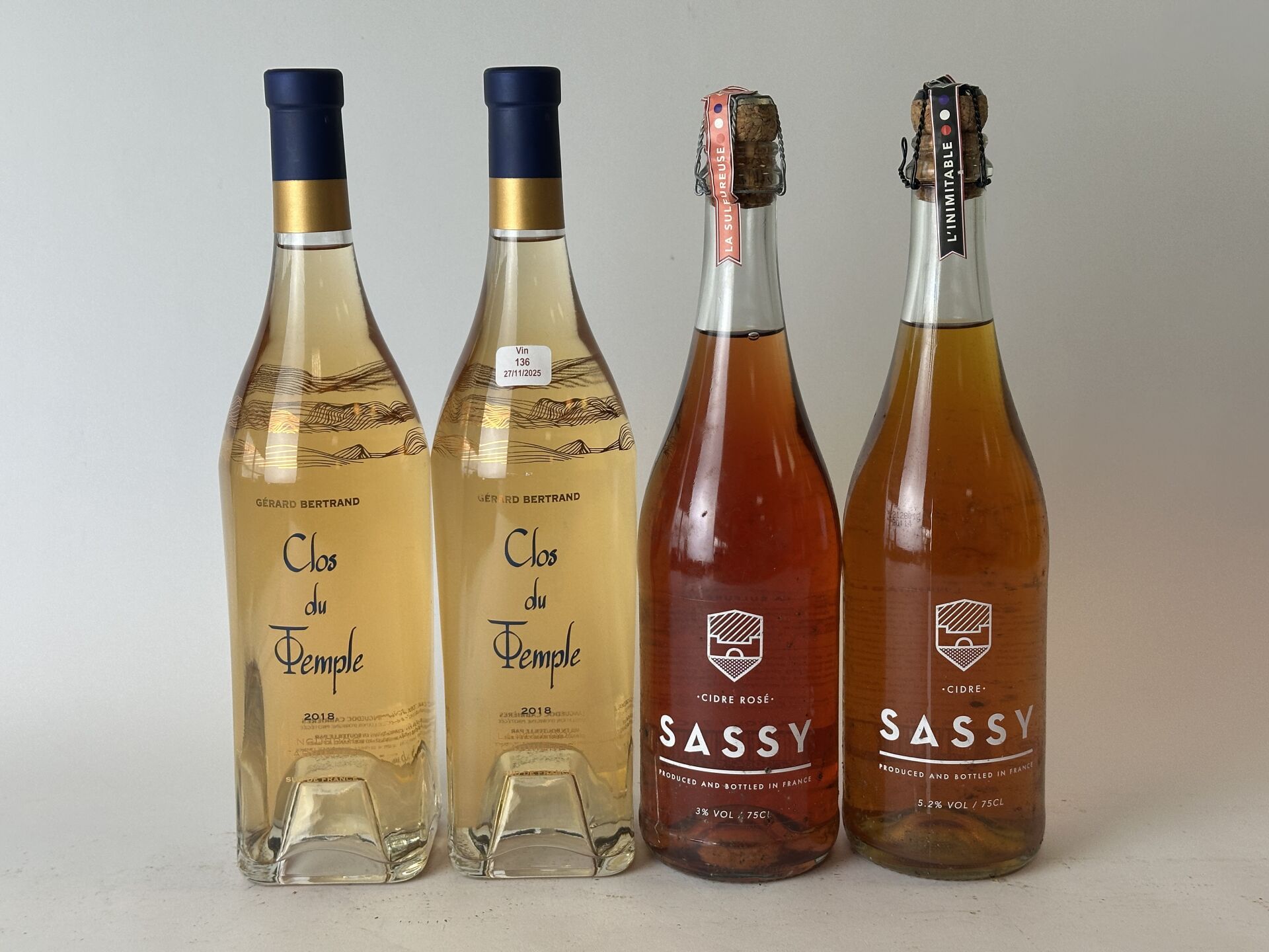 2 bouteilles de rosé Langeudoc Cabrières - Clos du Temple - GERARD BERTRAND - 2018. On joint : deux bouteilles de cidre Sassy, 1 rosé La sulfureuse et 1 classique L'inimitable