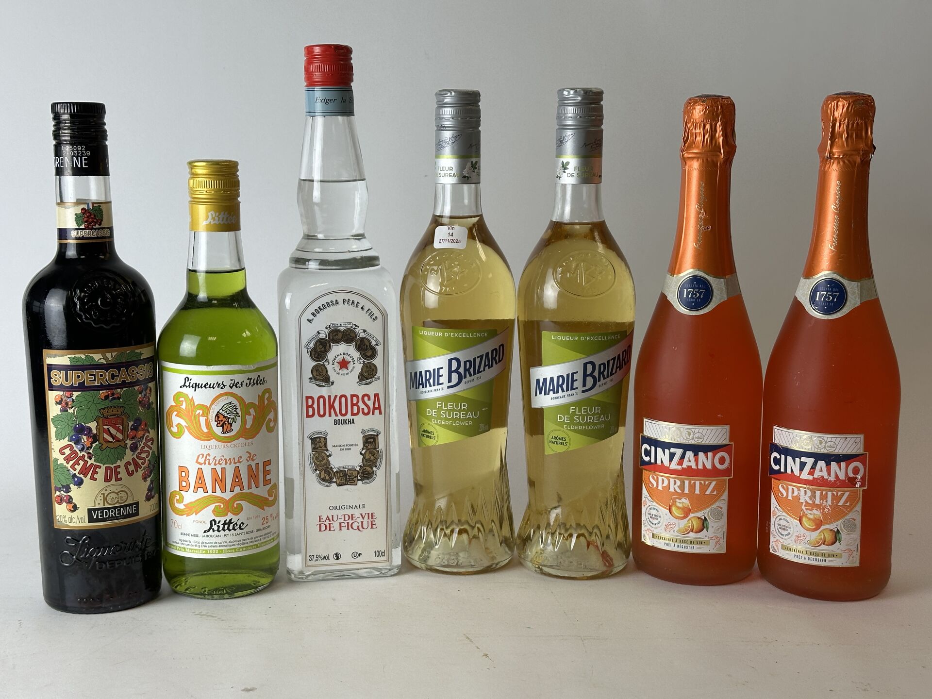 5 bouteilles de liqueurs et crèmes : 2 Marie Brizard Fleur de Sureau, 1 banane liqueur des îles, 1 crème de cassis et 1 eau de vie Bokobsa. On joint 2 Spritz Cinzano.