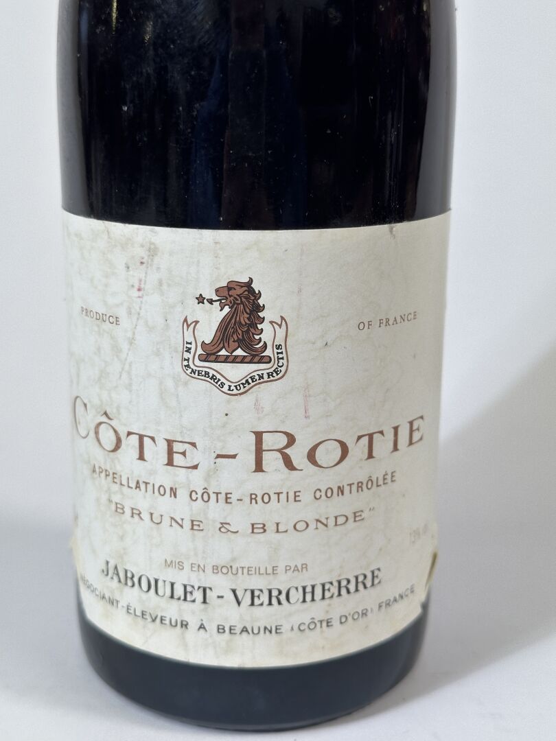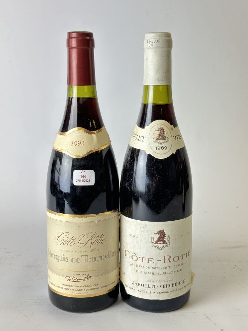 Réunion de deux bouteilles : - JABOUET-VERCHERRE - Côte-Rôtie, Brune & Blonde - 1989 (déchirures et taches à l'étiquette, quelques marques à la capsule). - Caves SAINT PIERRE - Côte Rôtie Marquis de Tournelles - 1992 (étiquette légèrement déchirée).