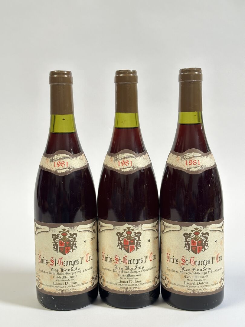 Trois bouteilles LES BOUDOTS - Nuits St Georges 1er Cru -1981 - bouteilles numérotées.