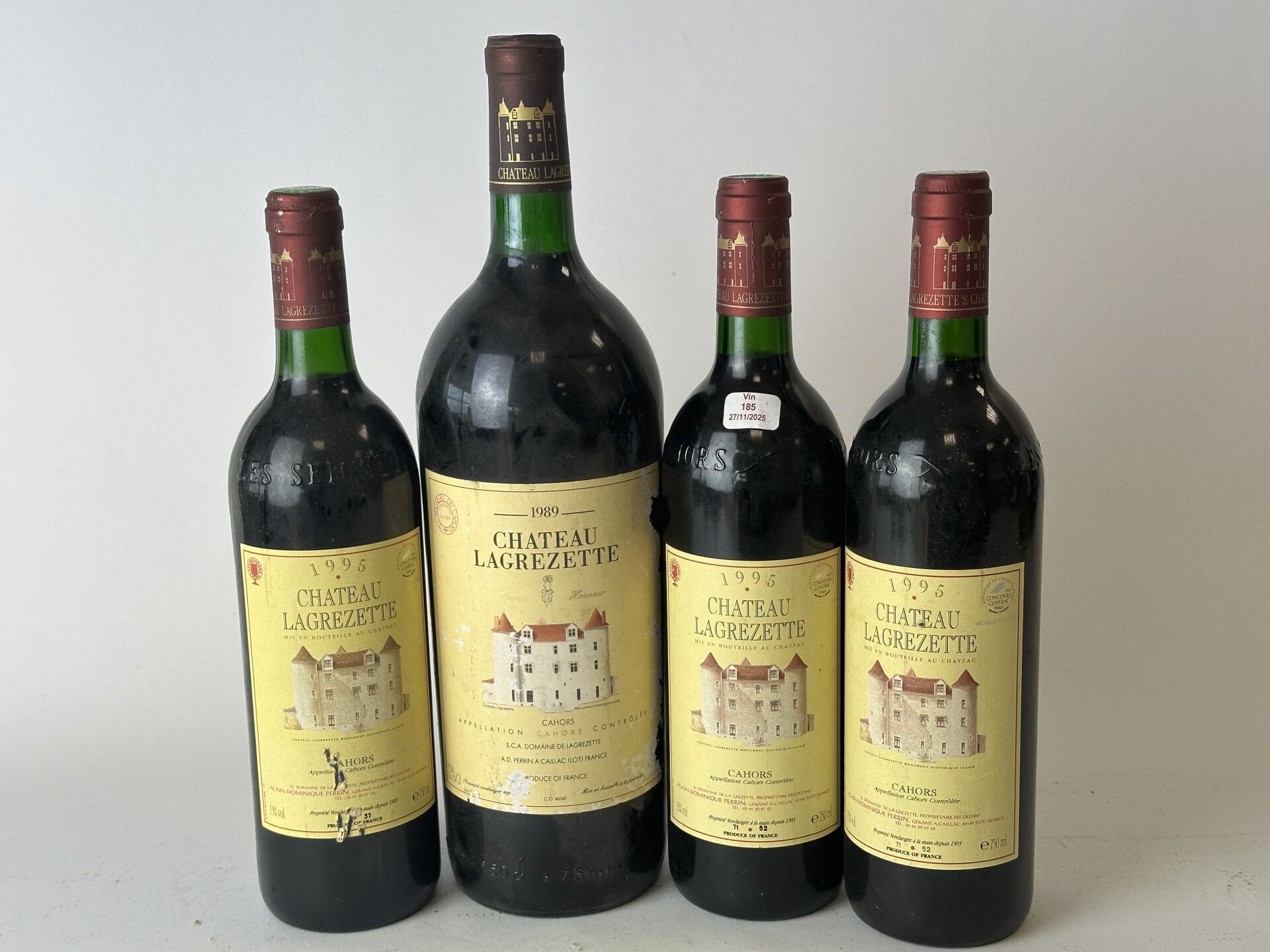 1 magnum et 3 bouteilles de Cahors - CHATEAU LAGREZETTE - 1989 pour le Magnum et 1995 pour les bouteilles (une étiquette légèrement déchirée).