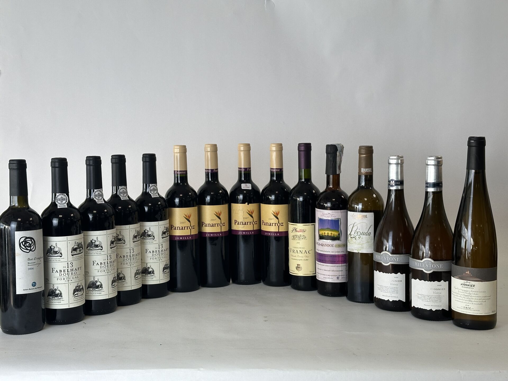 Réunion de 15 bouteilles de vin étrangers dont Douro du Portugal, Jumilla d'Espagne, Vranac du Monténégro, Viognier d'Australie, Gola-Qandoz d'Uzbékistan,...