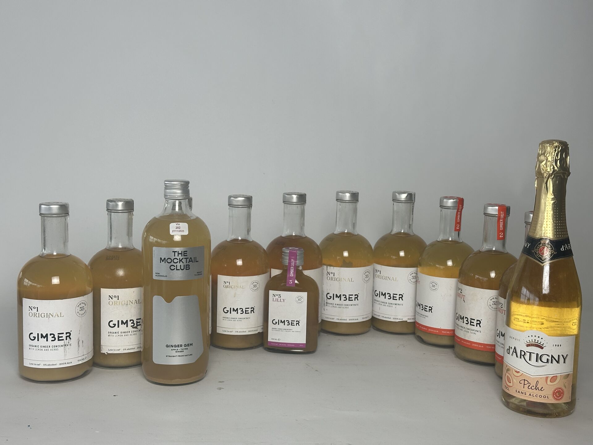 12 bouteilles de boissons sans alcool comprenant: 10 GIMBER (7 N°1 ORIGINAL et 3 N°2 BRUT), 1 bouteille de MOCKTAIL CLUB (apple-thyme-ginger), 1 bouteille de pétillant D'ARTIGNY pêche