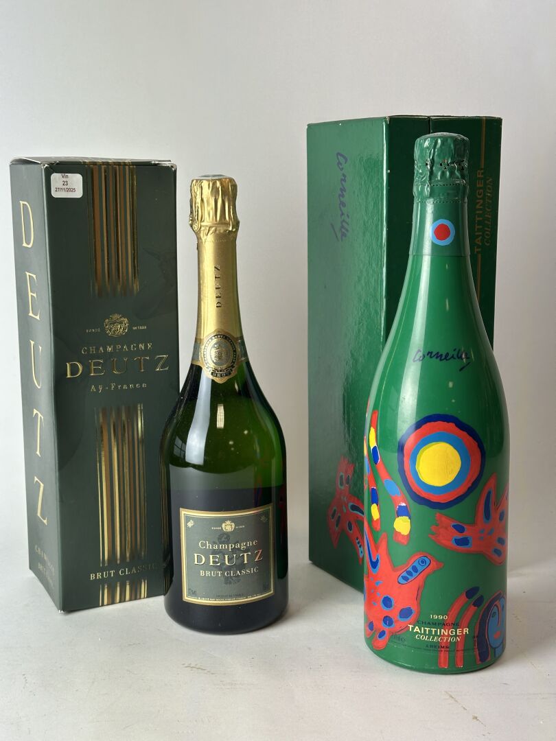 2 bouteilles de Champagne brut comprenant : - 1 DEUTZ brut classique en coffret; - 1 TAITTINGER Collection Corneille 1990 N°67 en coffret