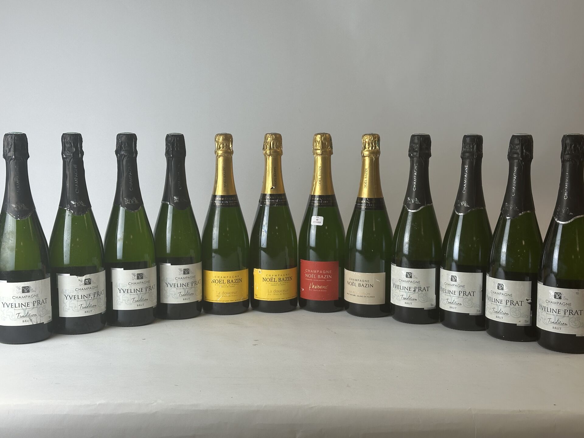 12 bouteilles de Champagne dont : Yveline Prat Tradition, Noël Bazin.