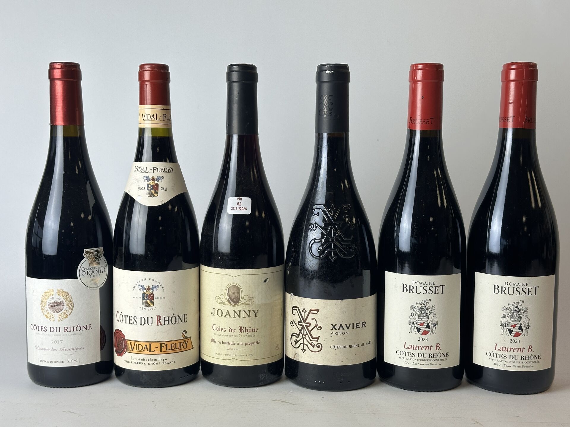 6 bouteilles de Côtes du Rhône dont Xavier Village 2020, Vidal Fleury 2021, Joanny 2023, Brusset 2023.
