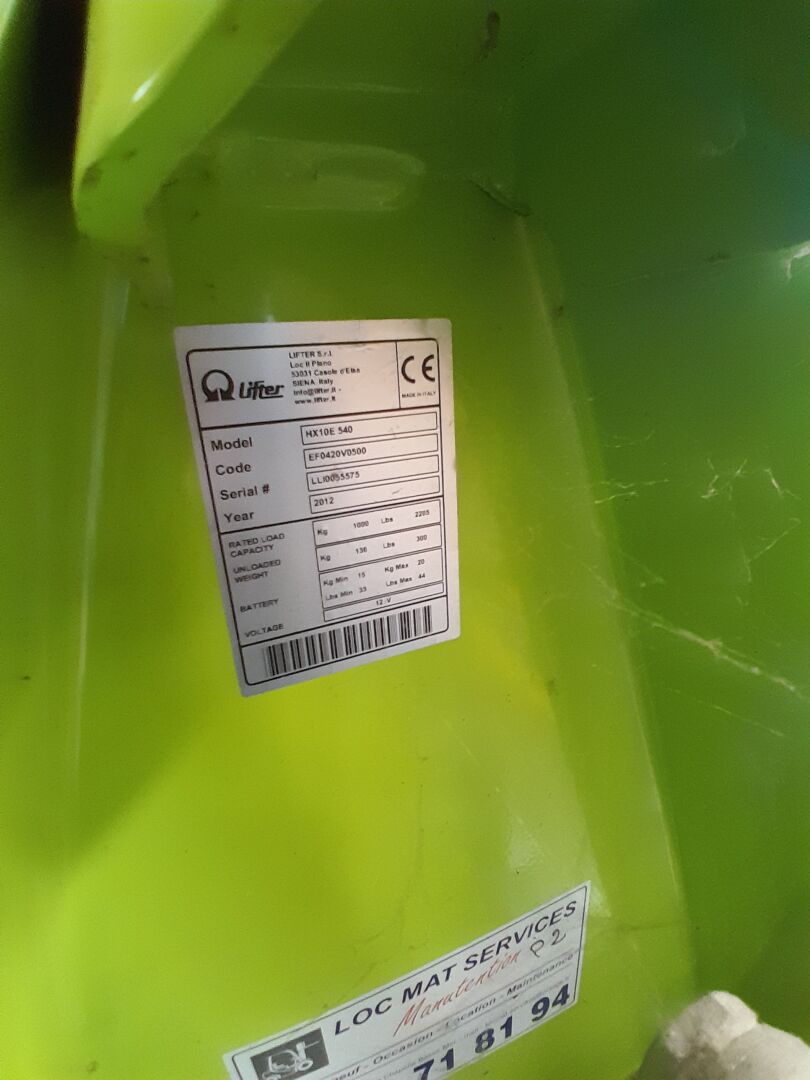 1 transpalette LIFTER BY PRAMAC HX 10 E 540 semi-électrique No LL0055575 de 2012 (frais de mise à disposition 10 € TTC)