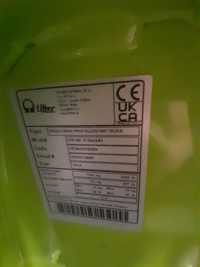 1 transpalette semi-électrique LIFTER PRAMAC HX 10E No HLi 0091888 de 2022 (frais de mise à disposition 10 € TTC)