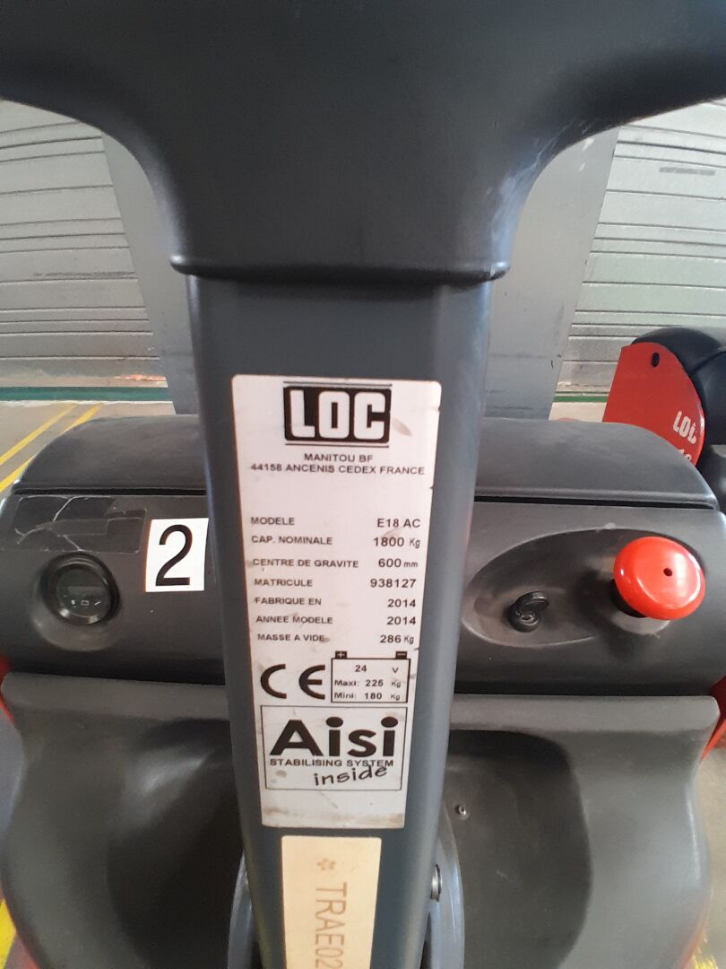1 transpalette électrique LOC E18 AC No 938127, capacité nominale 1800 kg, de 2014 (HALL LOGISTIQUE) (frais de mise à disposition 10 € TTC)