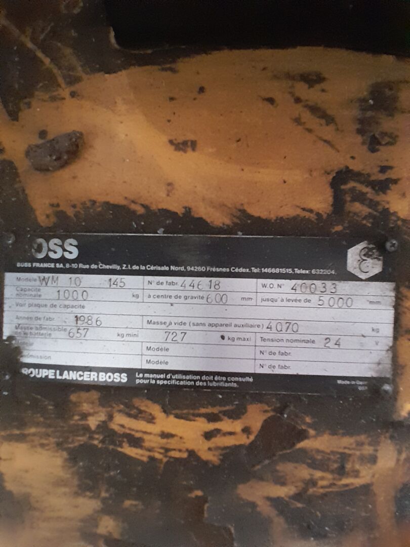 1 chariot élévateur électrique STEINBOCK BOSS WM 10 145 No 44618 capacité nominale 1000 kg de 1986, mat latéral, hauteur 5 m, état moyen (frais de mise à disposition 10 € TTC)