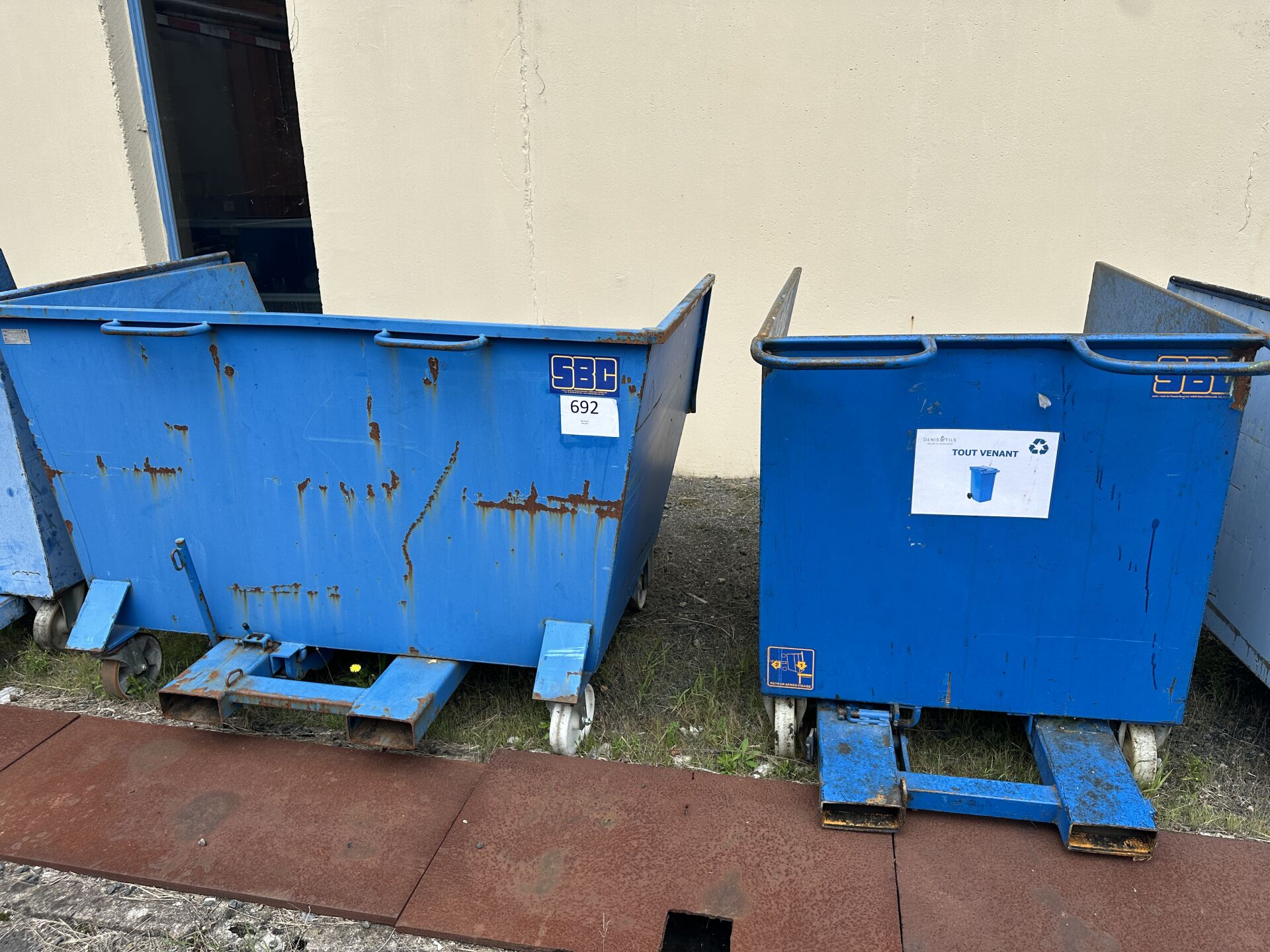 2 bennes mobiles métal bleu prise de fourche SBC basculantes : 1 en 1500 litres, 1 en 1800 litres (frais de mise à disposition 10 € TTC)