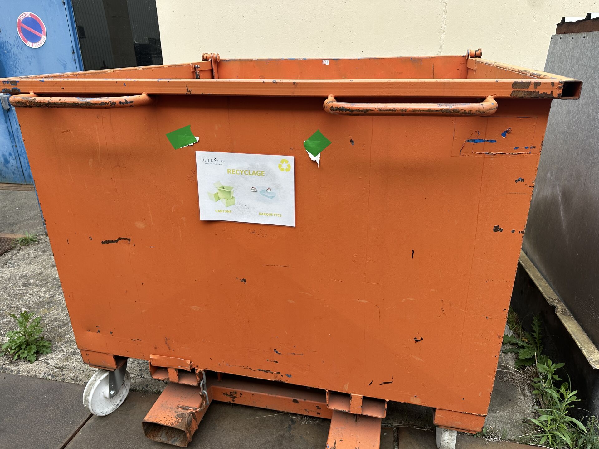 2 bennes mobiles métal orange prise de fourche SBC basculantes : 1 en 1500 L et 1 en 2140 L (frais de mise à disposition 10 € TTC)