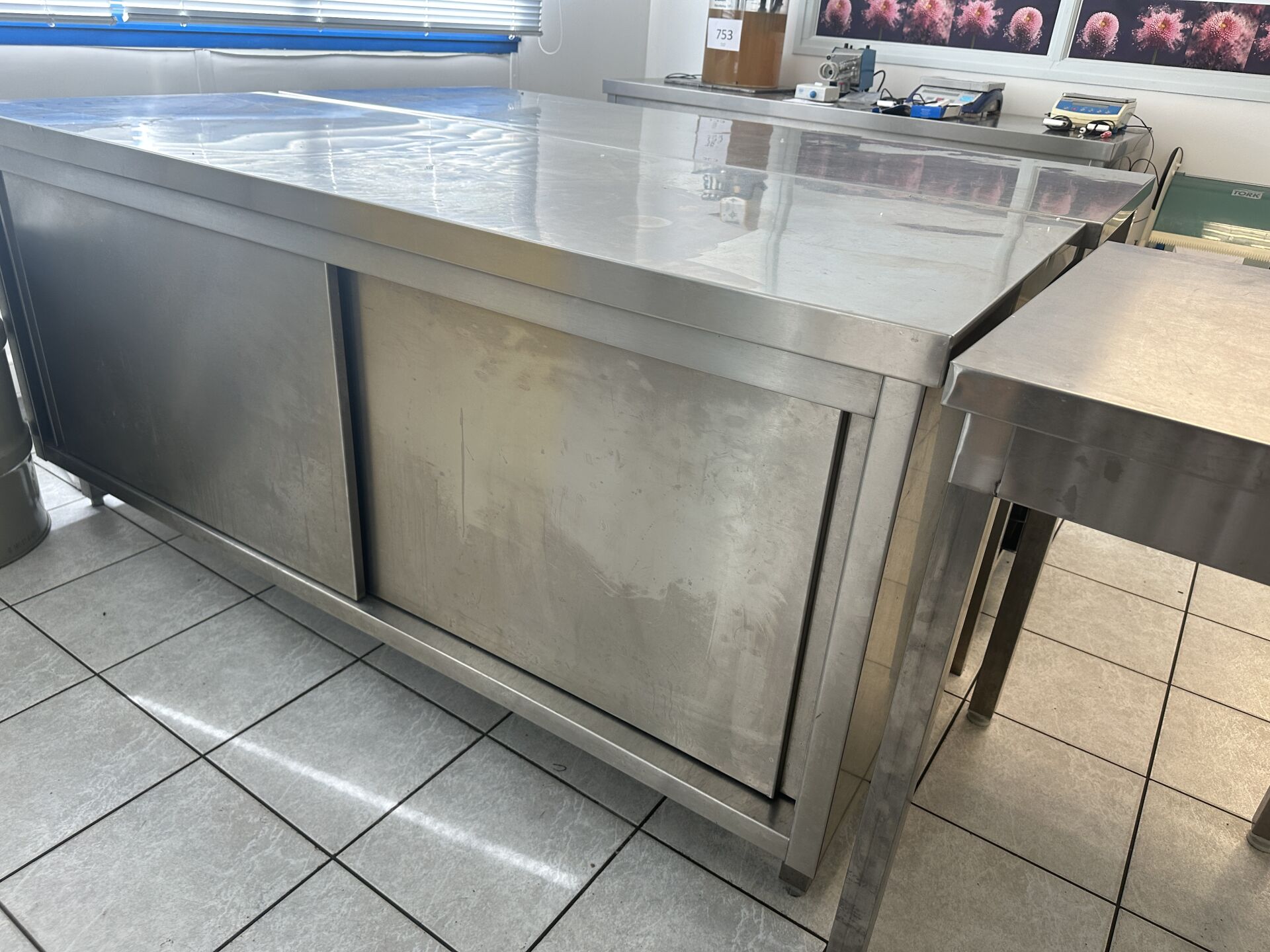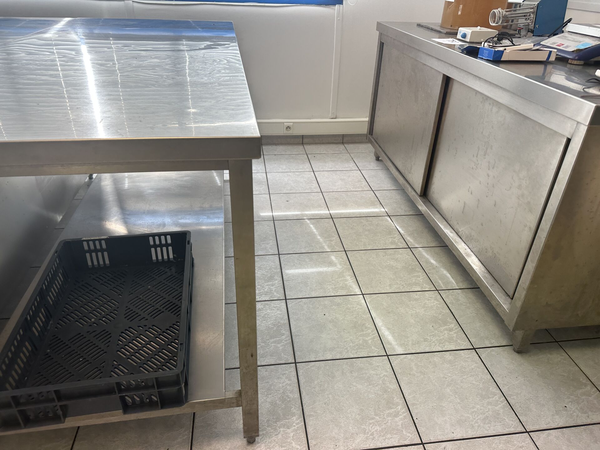 2 bahuts bas inox 2 portes coulissantes 180 x 70 cm 1 table inox 1 tablette d'entrejambe 180 x 75 cm 1 petite desserte inox 50 x70 cm (frais de mise à disposition 10 € TTC)