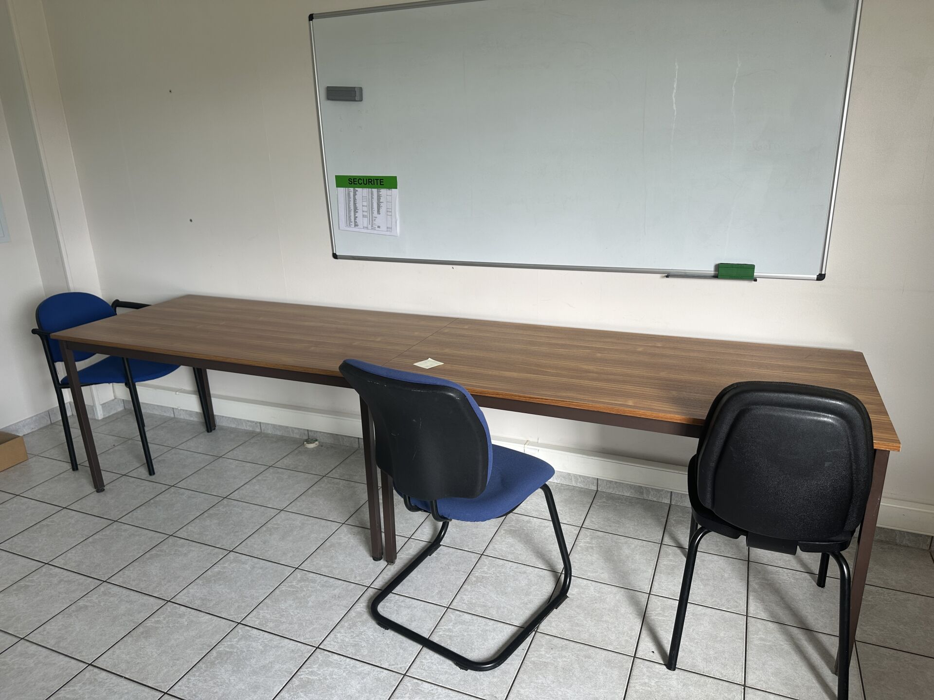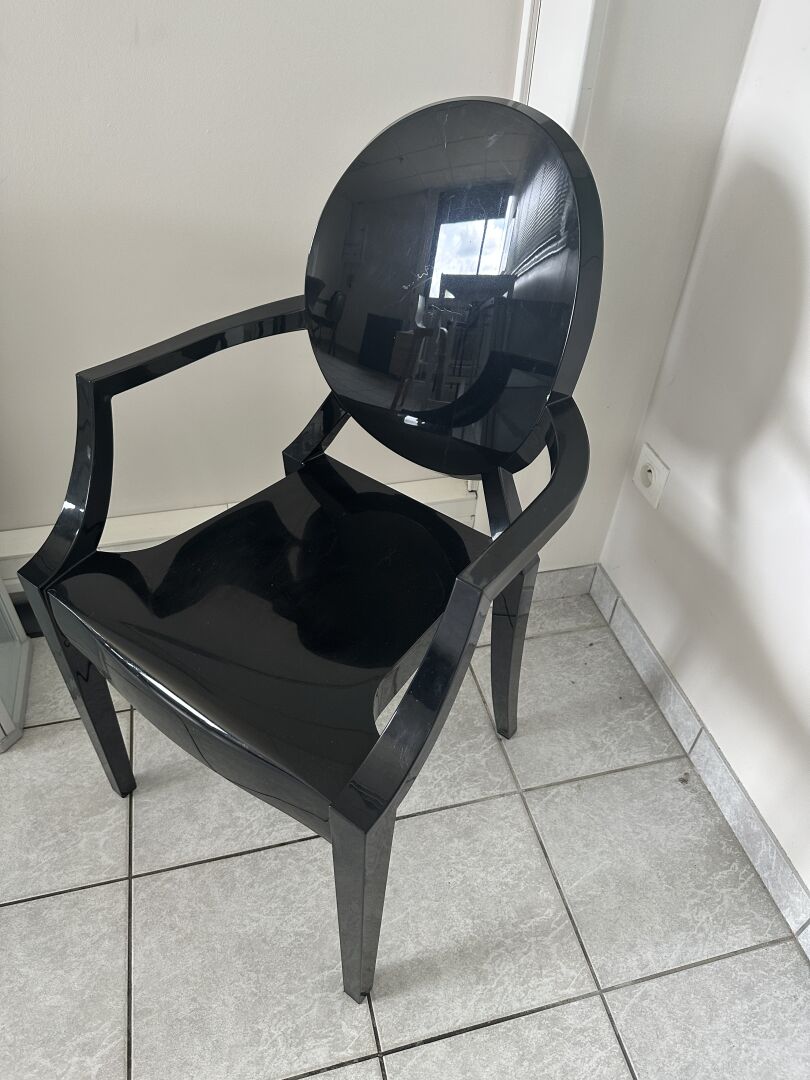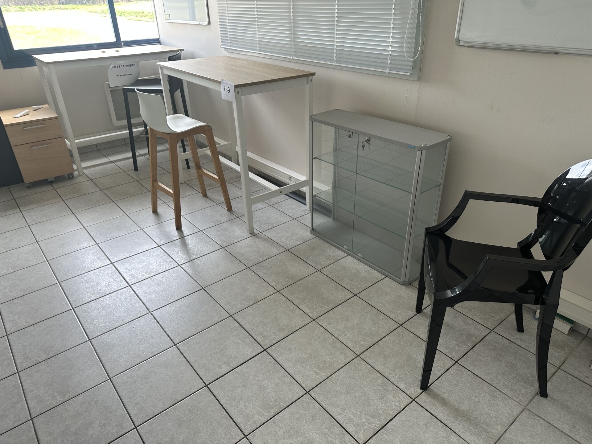1 chaise LOUIS GHOST KARTELL 1 vitrine basse en verre 83 x 26 x 81 cm 2 dessertes hautes plateau mélaminé façon bois 120 x 60 x 100 cm 1 armoire basse métal gris 80 x 41 x 72 cm 2 tables plateau mélaminé façon bois piètement brun 150 x 76 cm 5 chaises et tabourets dépareillés 1 grand tableau blanc, 1 caisson mobile (frais de mise à disposition 10 € TTC)