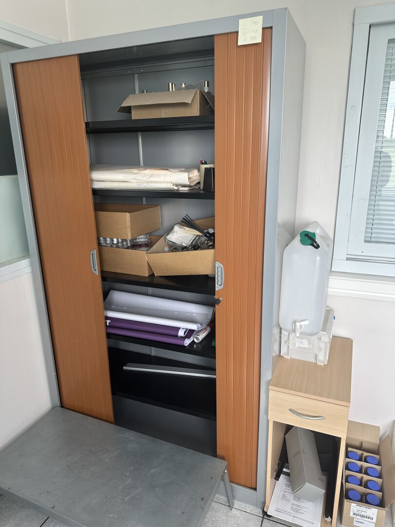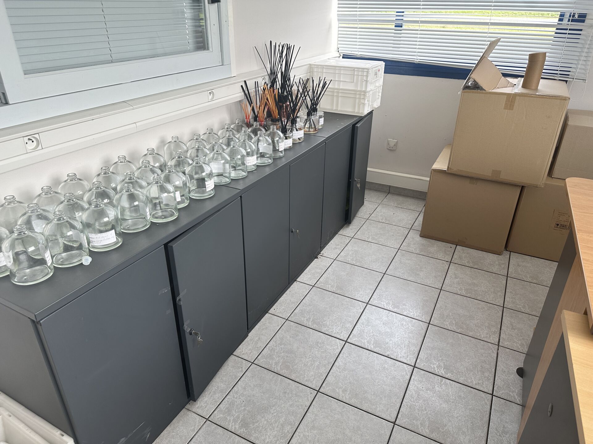 3 armoires basses métal gris 80 x 41 x 72 cm 1 armoire à rideaux 2 portes 120 x 43 x 200 cm 2 bureaux mélaminé façon bois dépareillés 188 x 103 et 160 x 80 cm 1 table métal gris piètement pliable 5 chaises dépareillées 1 paravent tissu bleu 1 lot de flacons, contenants tube carton, parfums etc (frais de mise à disposition 10 € TTC)