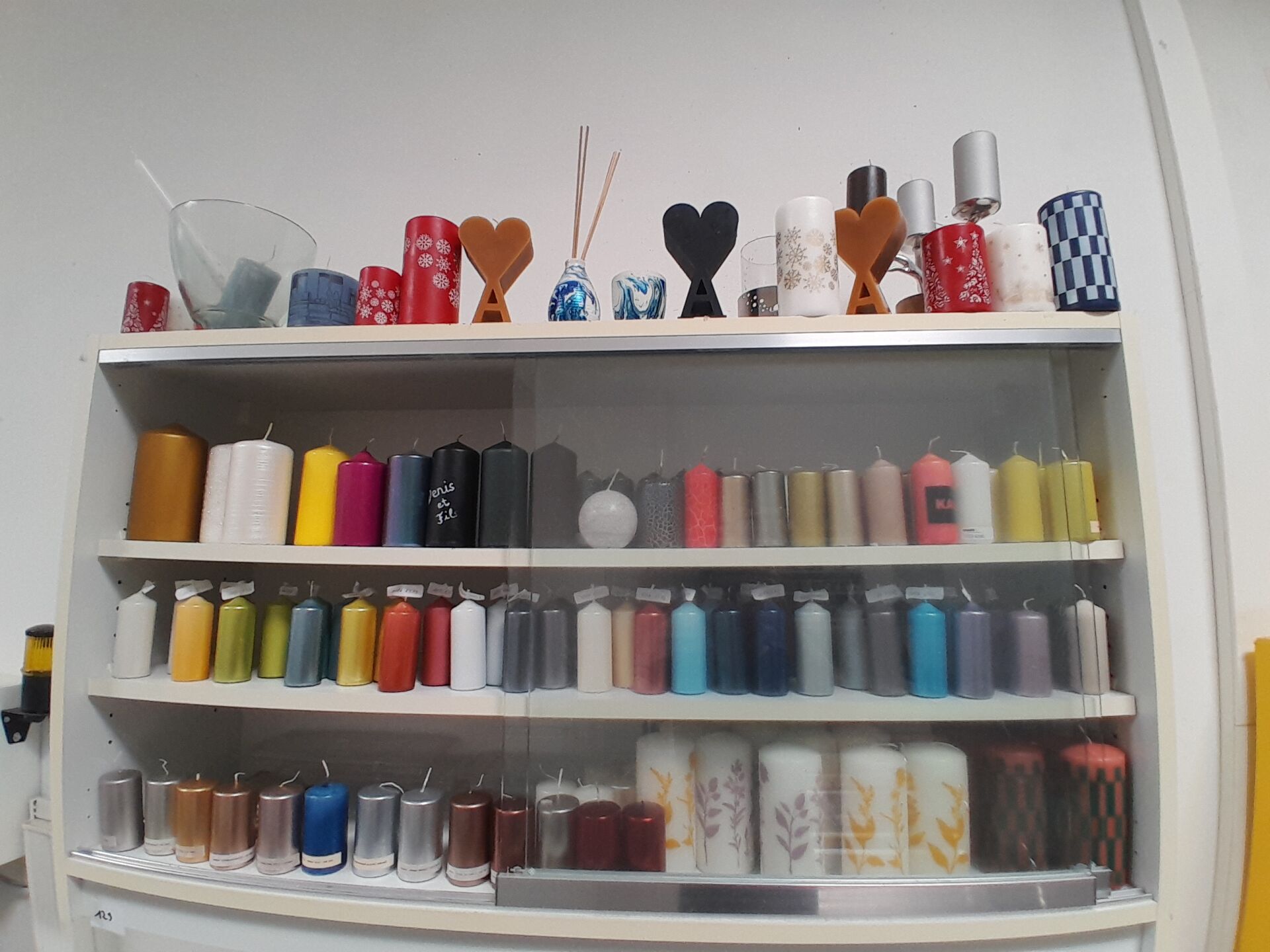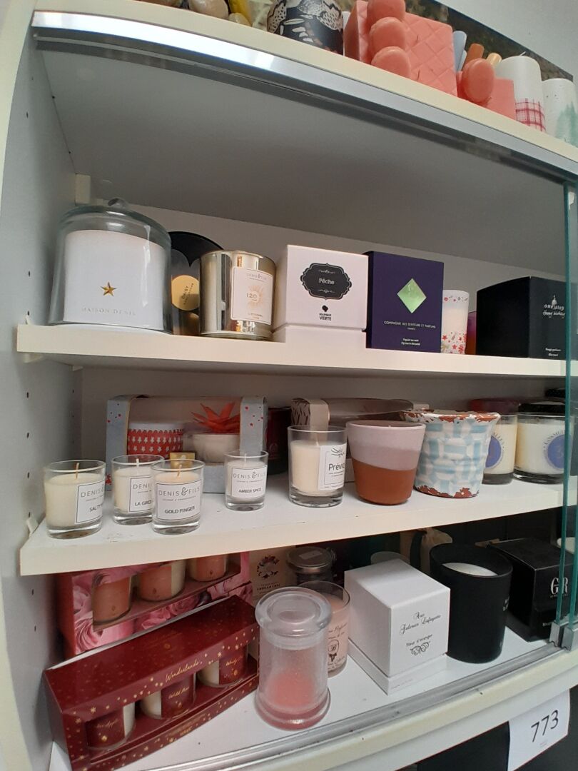 dans 2 vitrines murales : 1 petit stock de bougies différentes marques dont DENIS ET FILS, ONE STEP, PREVIA, BODY SHOP, BEAUTY SUCCESS, NUXE, ANN STEEGER, KAISER, etc environ 250 pièces (frais de mise à disposition 10 € TTC)