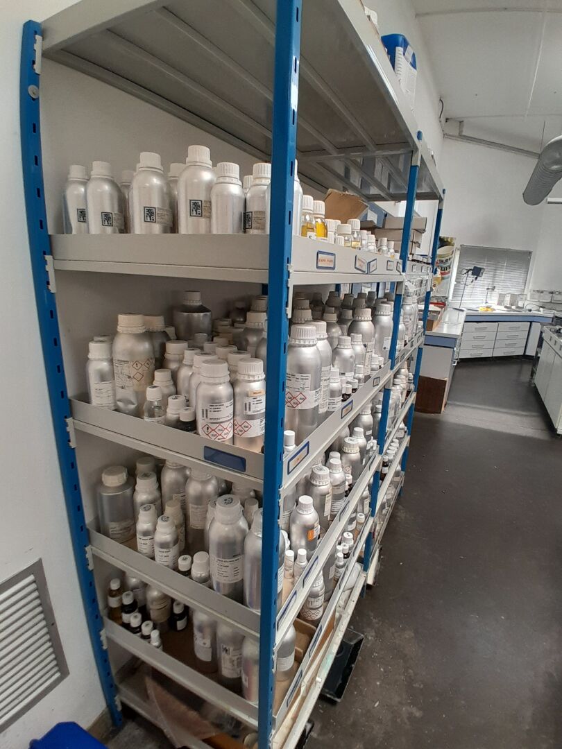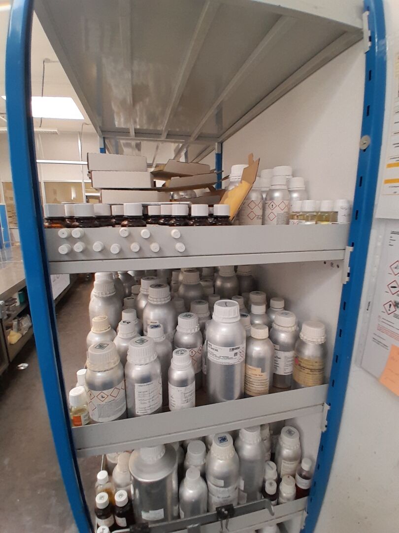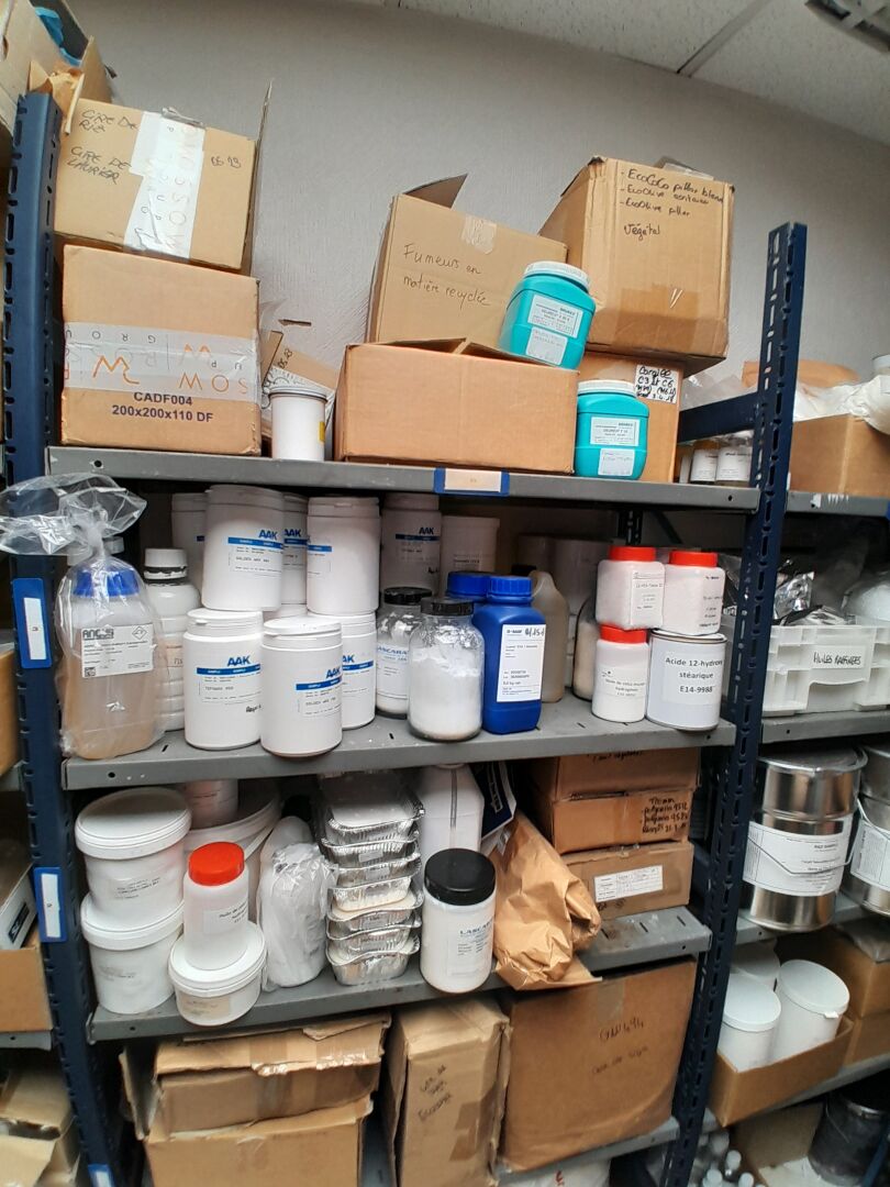 4 bureaux mélaminé blanc 180 x 75 cm avec 2 caissons 3 tiroirs intégrés et 4 meubles muraux assortis 2 portes 1 table mélaminé blanc piètement métal 121 x 60 cm 4 tabourets tournants simili cuir noir 1 plan de travail (paillasse de labo) mélaminé bleu et blanc avec 11 caissons mobiles, 2, 3 ou 4 tiroirs, en U (longueur totale 610 + 220 + 170 + 270 cm largeur 77 cm) 1 ilot central mélaminé blanc 210 x 130 cm avec contenu de matières premières pour la conception de bougies dont environ 700 flacons de parfums, mèches de différentes références, barquettes alu de trempage, produits chimiques (behenate de glycerol, acide sulfurique, crystalsense, huile de ricin ...) contenants pour bougies (verres etc), vernis etc on y joint le contenu d'une petite réserve (porte en face) dont cires, huiles, paraffines, vaseline, mèches, iridin, contenants pour bougies (pots, verres) , ustensiles inox (pichets, pots), matériel rebuté (frais de mise à disposition 10 € TTC)