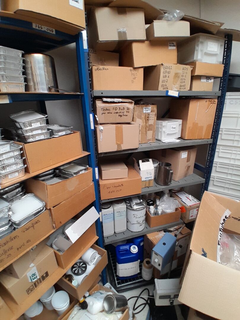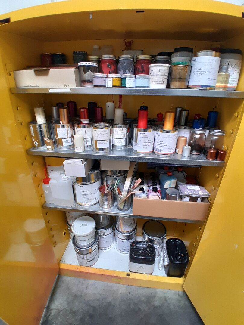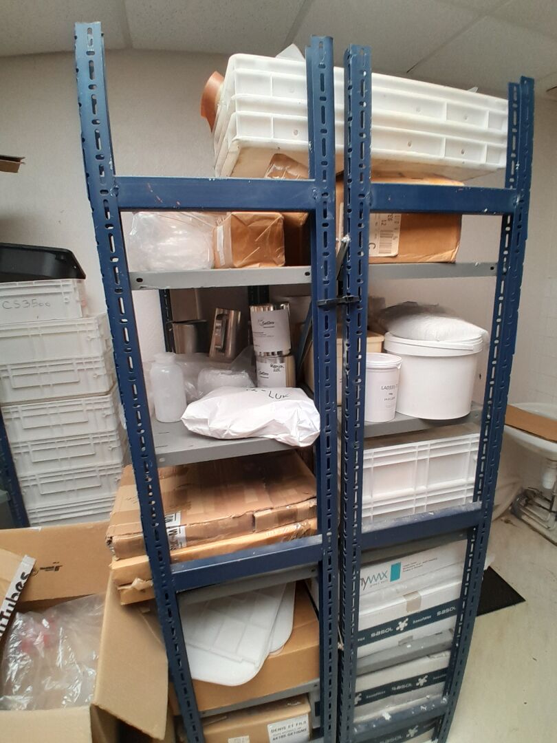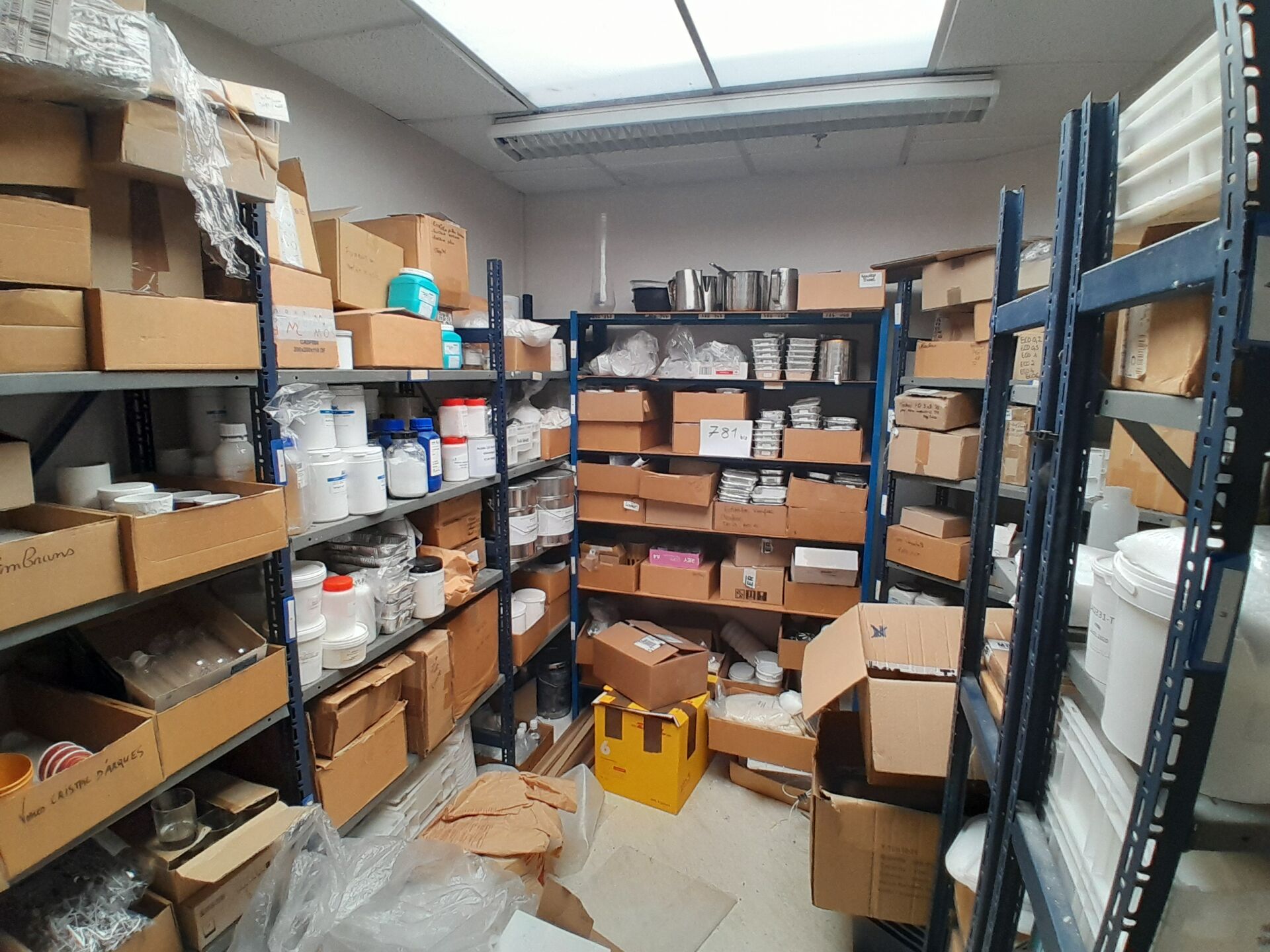 4 bureaux mélaminé blanc 180 x 75 cm avec 2 caissons 3 tiroirs intégrés et 4 meubles muraux assortis 2 portes 1 table mélaminé blanc piètement métal 121 x 60 cm 4 tabourets tournants simili cuir noir 1 plan de travail (paillasse de labo) mélaminé bleu et blanc avec 11 caissons mobiles, 2, 3 ou 4 tiroirs, en U (longueur totale 610 + 220 + 170 + 270 cm largeur 77 cm) 1 ilot central mélaminé blanc 210 x 130 cm avec contenu de matières premières pour la conception de bougies dont environ 700 flacons de parfums, mèches de différentes références, barquettes alu de trempage, produits chimiques (behenate de glycerol, acide sulfurique, crystalsense, huile de ricin ...) contenants pour bougies (verres etc), vernis etc on y joint le contenu d'une petite réserve (porte en face) dont cires, huiles, paraffines, vaseline, mèches, iridin, contenants pour bougies (pots, verres) , ustensiles inox (pichets, pots), matériel rebuté (frais de mise à disposition 10 € TTC)