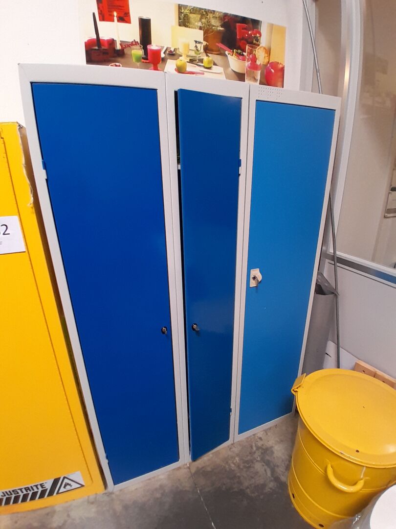 1 vestiaire métal gris et bleu 2 portes 71 x 51 x 180 cm 1 vestiaire métal gris et beu 1 porte 45 X 51 X 180 cm 1 armoire de stockage de produits dangereux métal jaune 2 portes 110 x 48 x 166 cm 1 étagère cornière 2 modules métal bleu 6 niveaux 202 x 60 x 202 cm (frais de mise à disposition 10 € TTC)