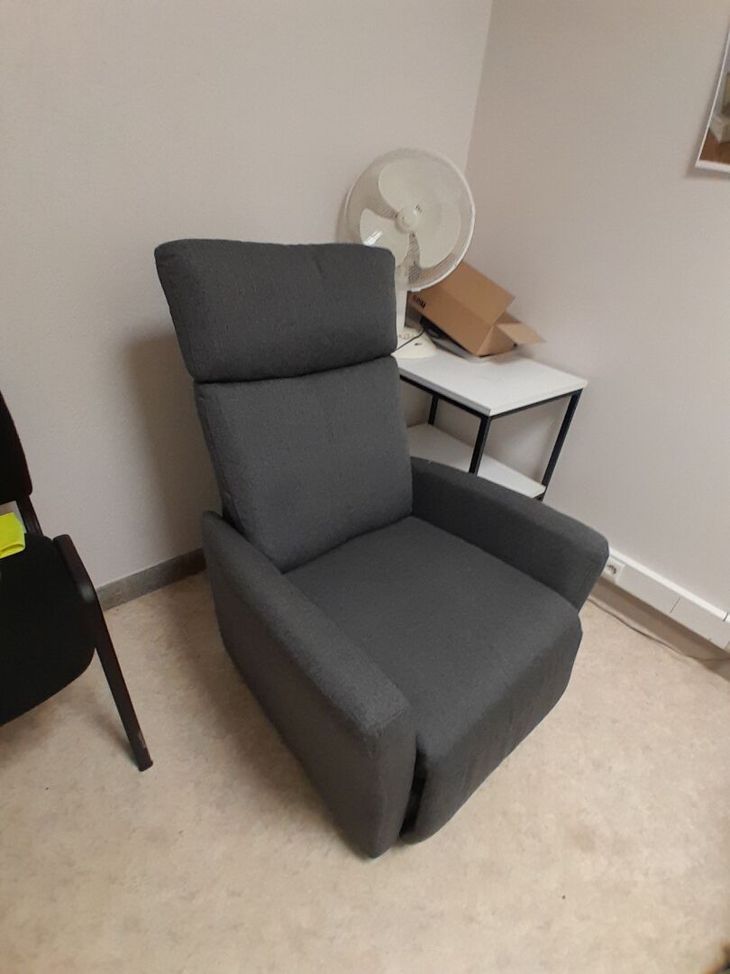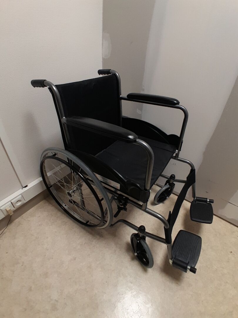 1 fauteuil de repos tissu gris 1 civière pliante 1 fauteuil roulant CLINICAL 1 desserte mobile double plateau mélaminé blanc 1 ventilateur 1 vestiaire 2 cases métal gris 60 x 50 x194 cm 7 étagères cornière métal bleu 100 x 40 x 200 cm (frais de mise à disposition 10 € TTC)