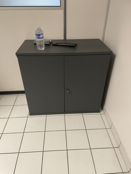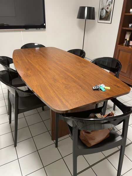 1 table de réunion mélaminé façon bois 200 x 100 cm 7 chaises PVC noir 1 meuble bois, 2 portes en partie basse 111 x 40 x 201 cm 1 lampe abat jour noir 1 meuble mi-hauteur métal gris 2 portes 1 vitrine 3 niveaux à portes coulissantes 76 x 42 x 186 cm 1 tableau blanc effaçable (frais de mise à disposition 10 € TTC)
