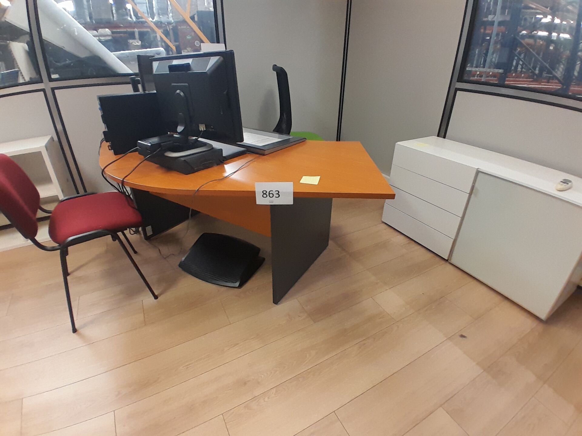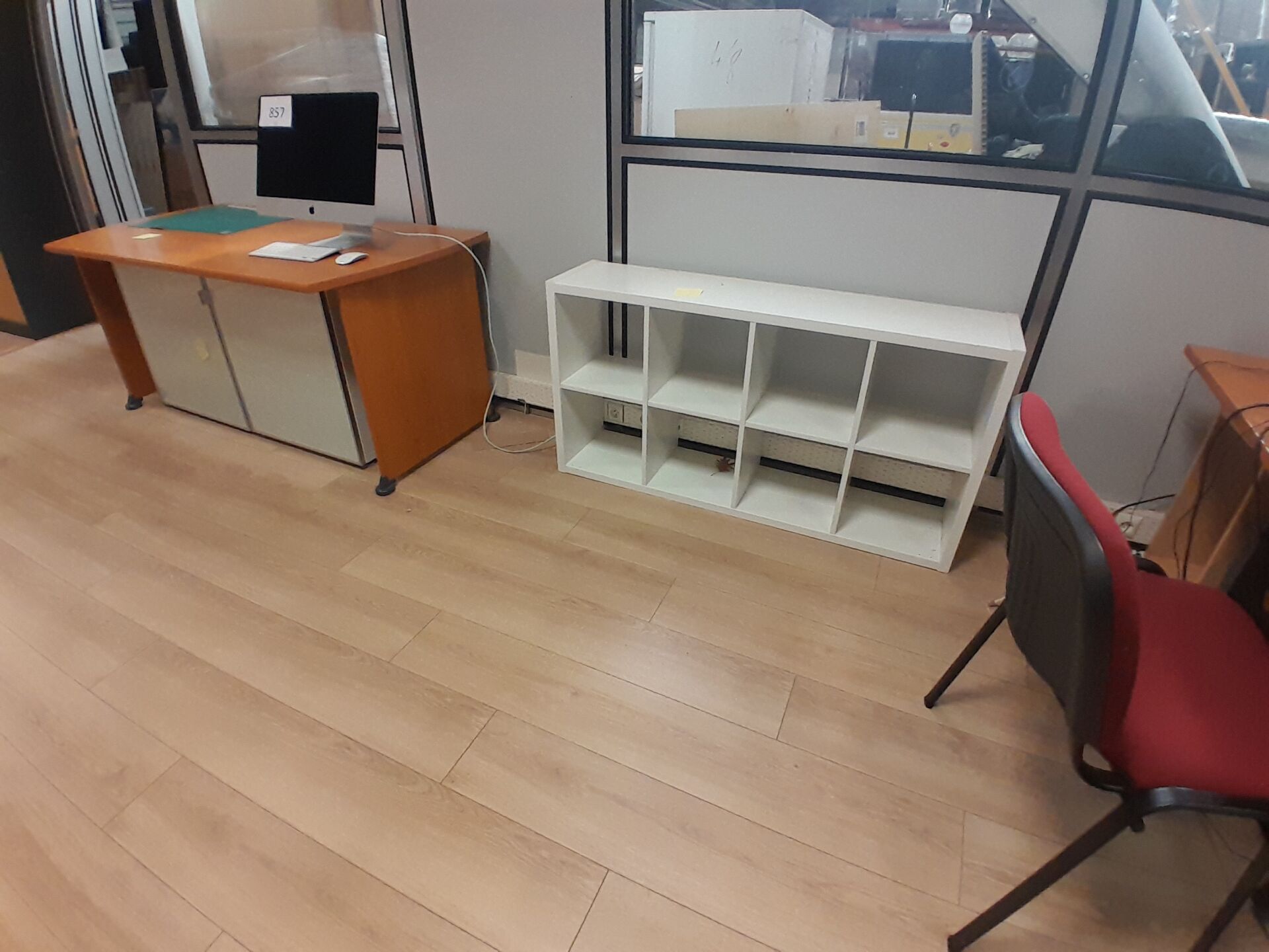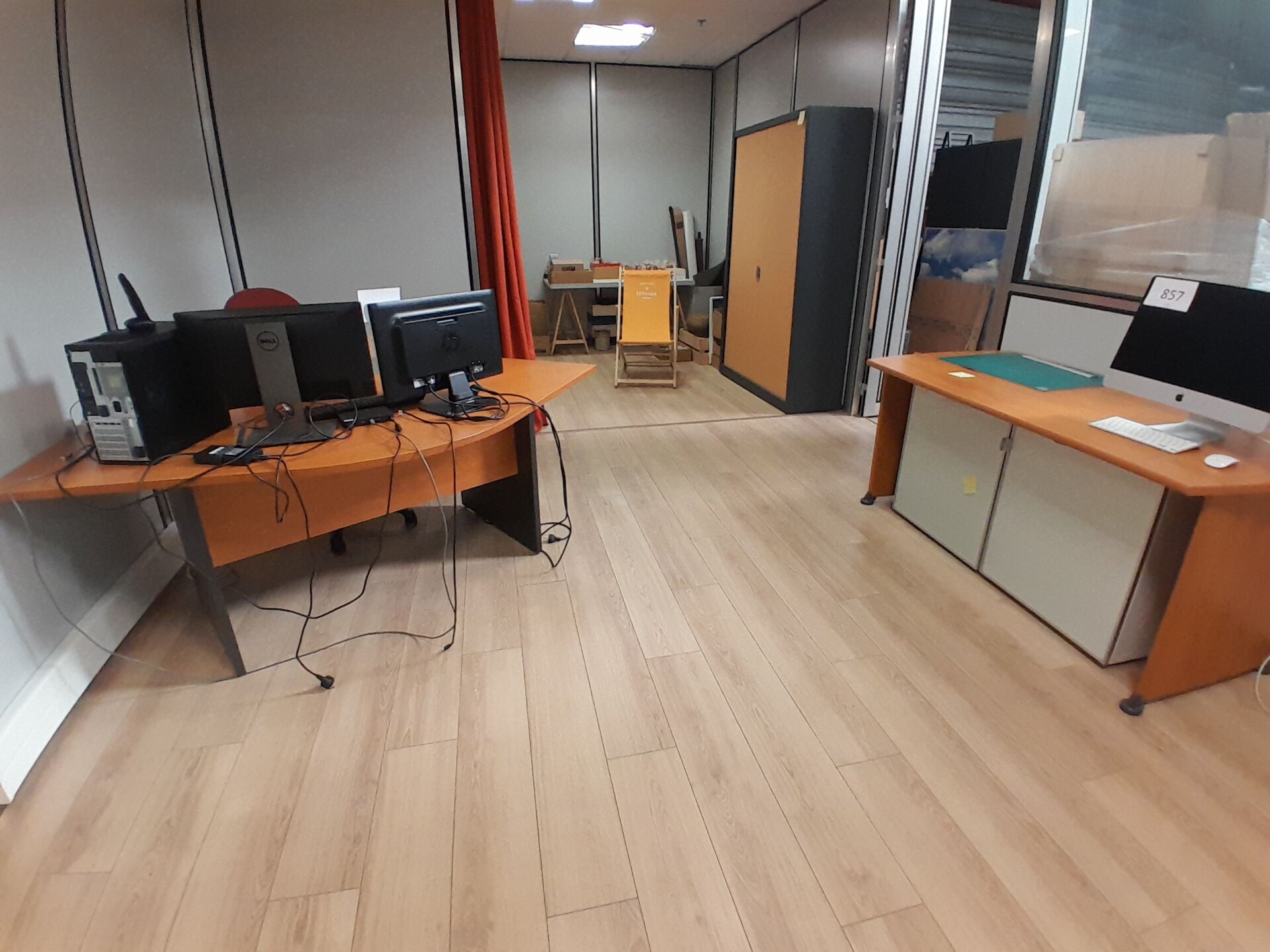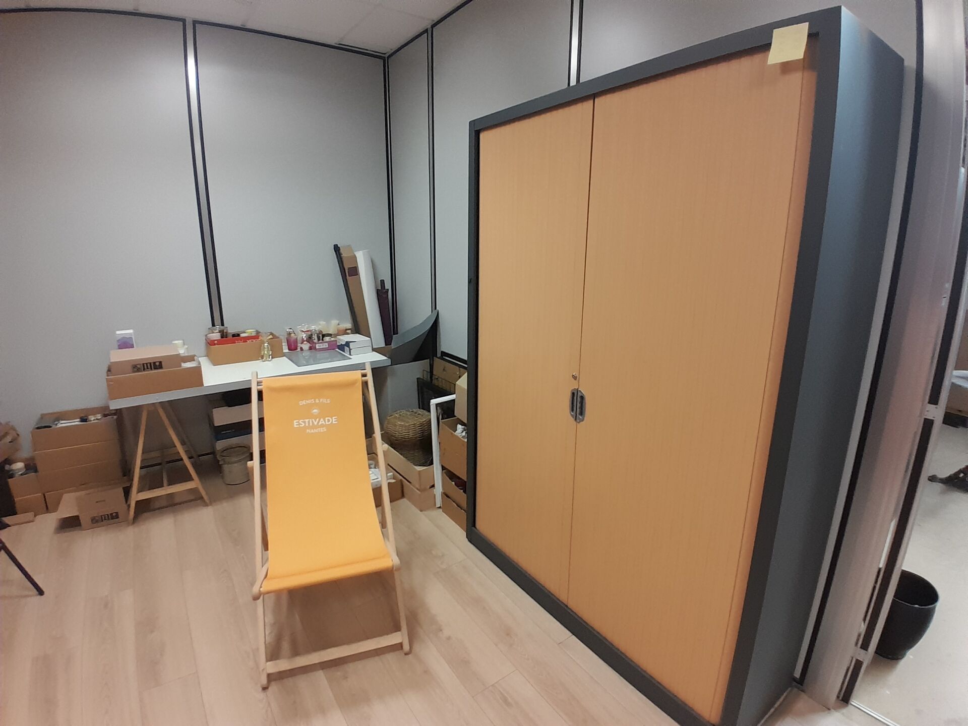 3 bureaux mélaminé façon bois 210 X 95 cm et 160 x 80 cm + 1 meuble bas 2 portes vitrées blanc 120 x 42 x 66 cm 2 chaises tournantes et roulantes tissu noir/vert et rouge 1 meuble mélaminé blanc 8 cases 131 x 30 x 70 cm 1 meuble mi hauteur mélaminé blanc 1 porte et 4 tiroirs 120 x 40 x 66 cm 1 armoire métal gris à rideau coulissant façon bois 140 x 43 x 198 cm 1 meuble mi-hauteur mélaminé façon bois à portes coulissantes 110 x 43 x 114 cm avec contenu de bougies et échantillons 1 transat bois et tissu logoté, 1 plateau mélaminé blanc 150 x 75 cm sur tréteaux bois, échantillons de bougies, parfums etc (frais de mise à disposition 10 € TTC)