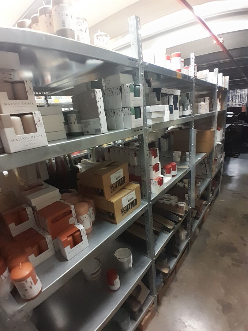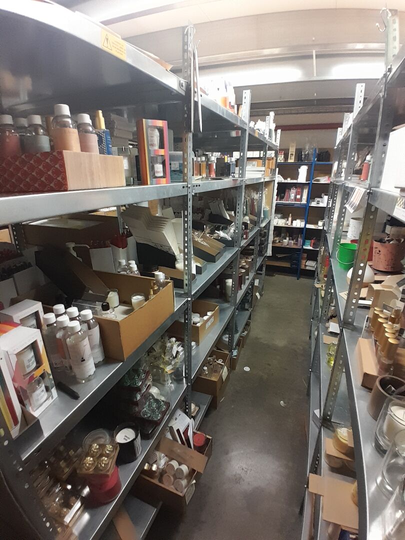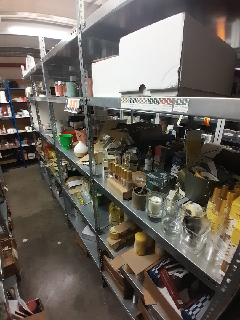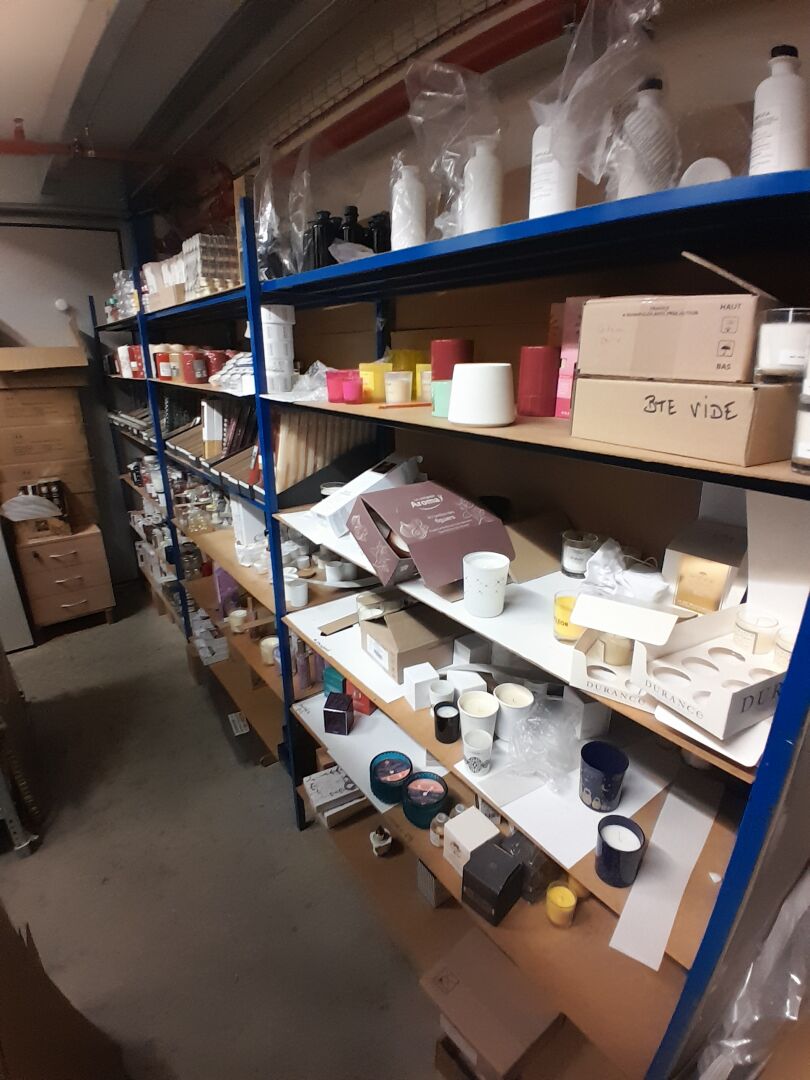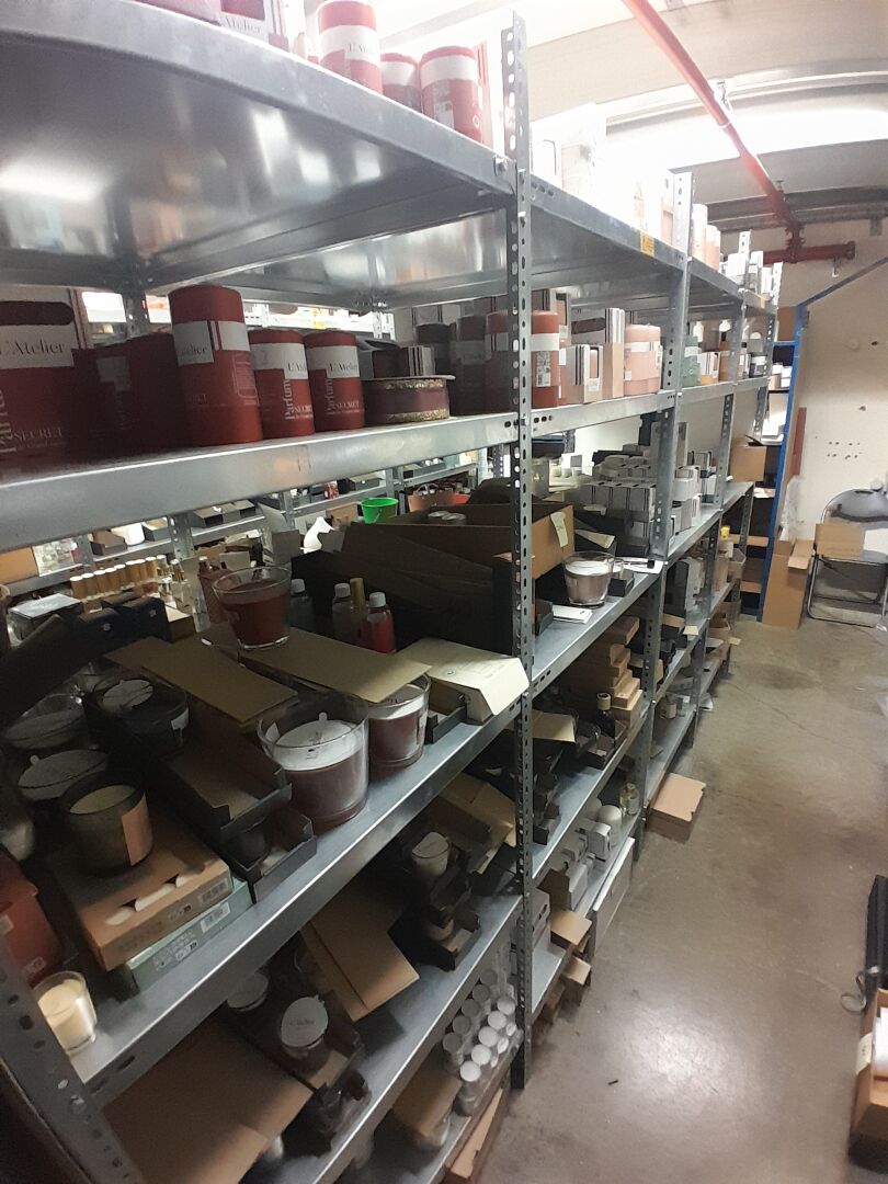 1 stock d'échantillons de bougies, parfums d'intérieur, contenants à bougies verre ou céramique, le tout dans 5 travées d'étagères (frais de mise à disposition 10 € TTC)