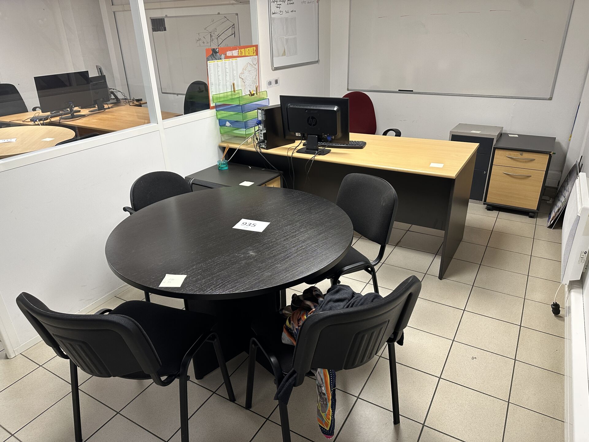 1 bureau mélaminé façon bois et gris L 180 P 80 H 76 cm 2 caissons mobiles assortis 2 tiroirs + 1 caisson métallique 3 tiroirs 40 X 40 X 66 cm 2 tableaux blancs 1 table ronde mélaminé noir diam 110 H 74 cm 4 chaises visiteurs tisus noir 1 fauteuil tournant et roulant tissu bordeaux 1 accoudoir cassé (frais de mise à disposition 10 € TTC)
