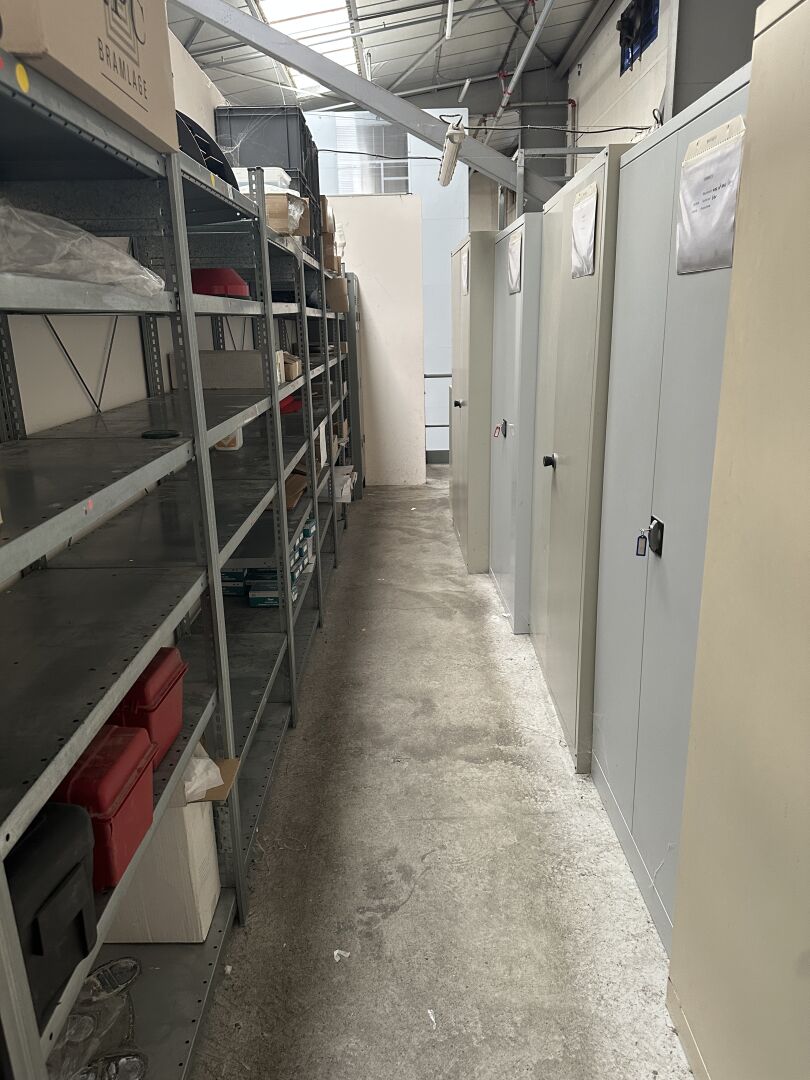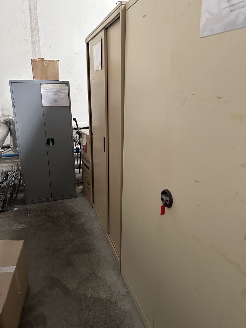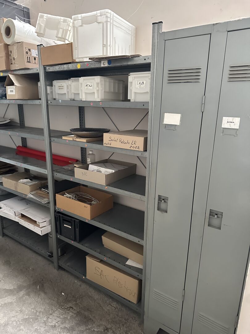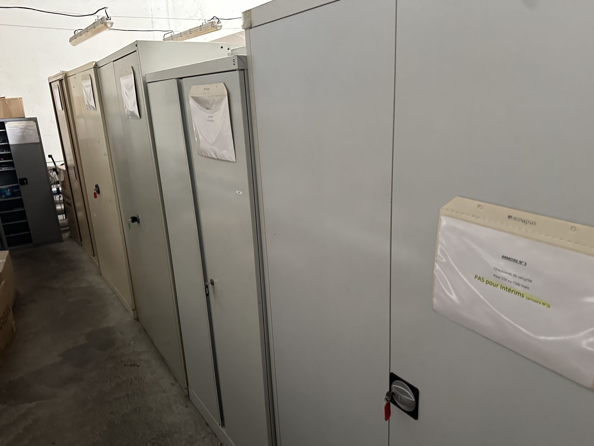 11 armoires 2 portes métal beige ou gris différents modèles, 1 vestiaire 2 portes métal gris 7 modules d'étagères galva, bacs plastique de rangement (frais de mise à disposition 10 € TTC)
