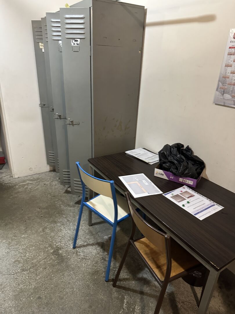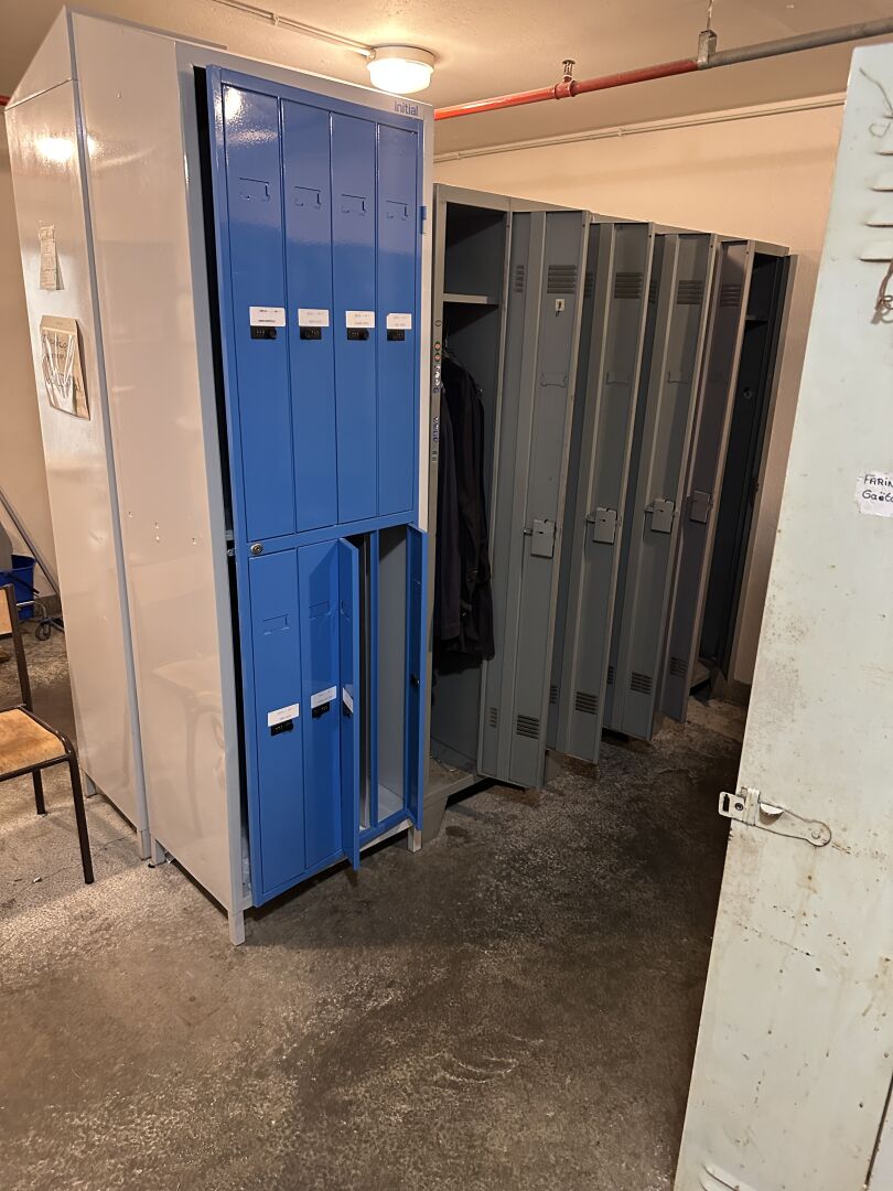 VESTIAIRES HOMMES : 2 modules 2 cases métal gris clair 259 X 50 X 180 cm 3 modules 4 cases métal gris ou beige 120 X 50 X 195 cm 10 modules gris 2 cases 60 X 50 X 193 cm 1 module 1 case métal bleu 41 x 50 x 1225 cm 1 vestiaire 8 cases superposées 2 à 2 67 x 50 x 224 cm 1 table 130 x 65 cm, 4 chaises (frais de mise à disposition 10 € TTC)