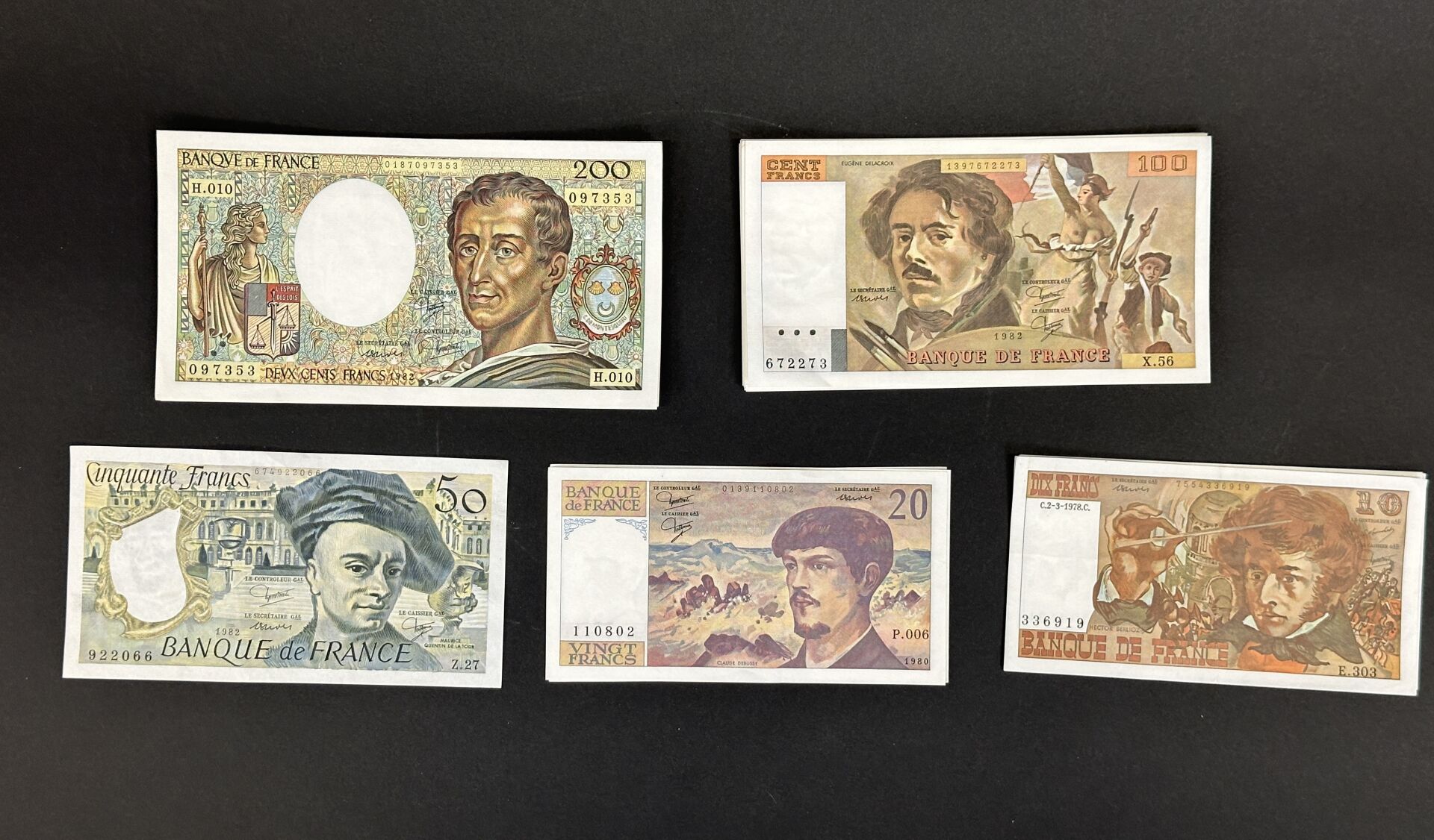 Ensemble de billets français comprenant : - Cinq billets de deux cent francs. - Treize billets de cent francs Delacroix. - Un billet de cinquante francs. - Trois billets de vingt francs. - Trois billets de dix francs.