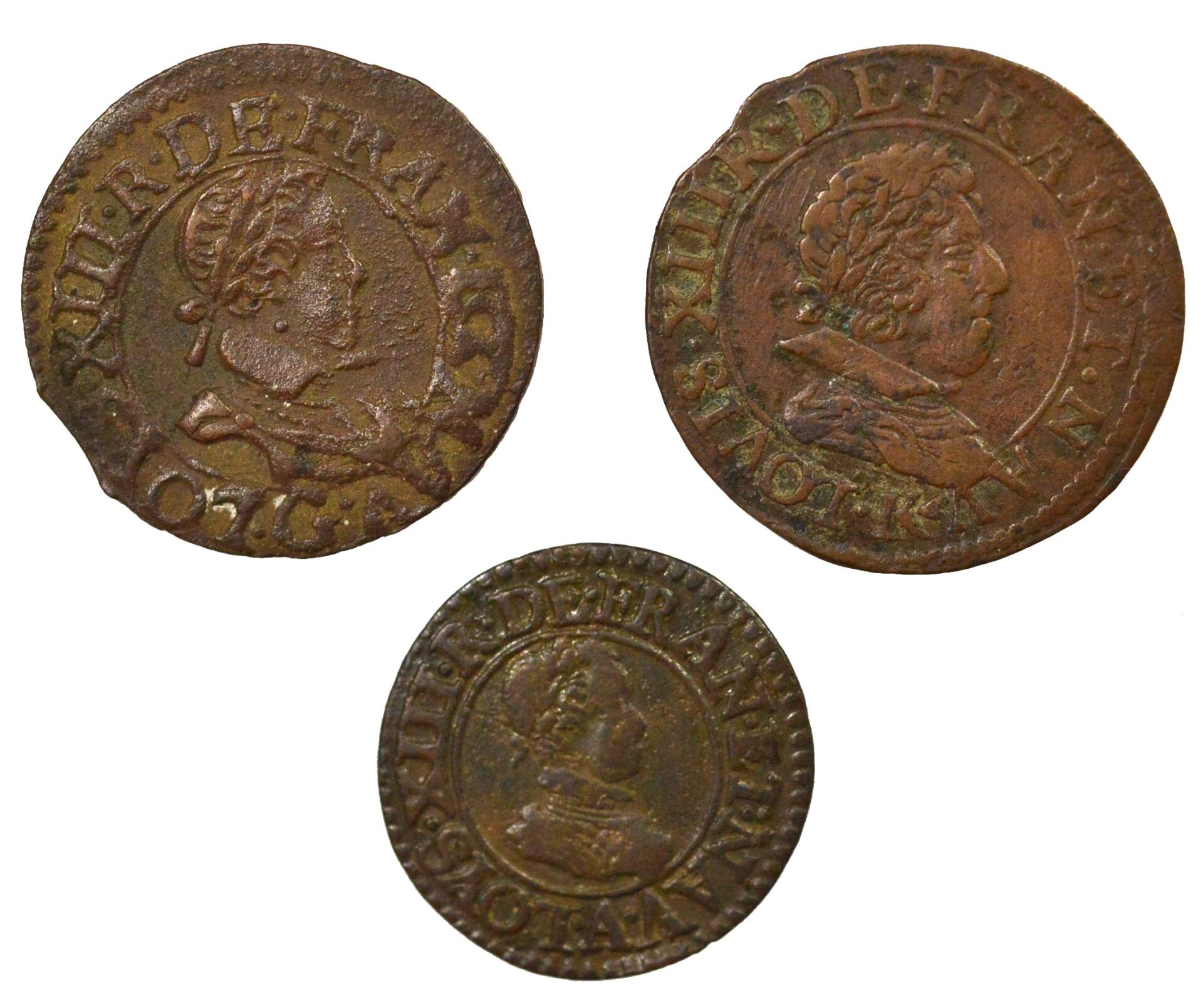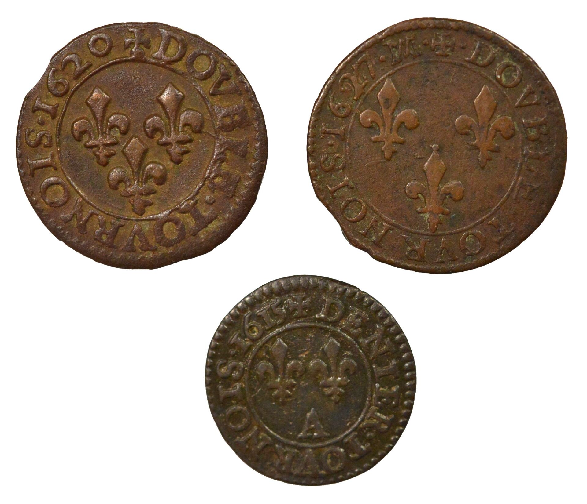 Ensemble de 3 monnaies de Louis XIII : - Denier Tournois, 1615 Paris, TTB - Double Tournois, 1627 Bordeaux, TTB - Double Tournois, 1620 Poitiers, TTB