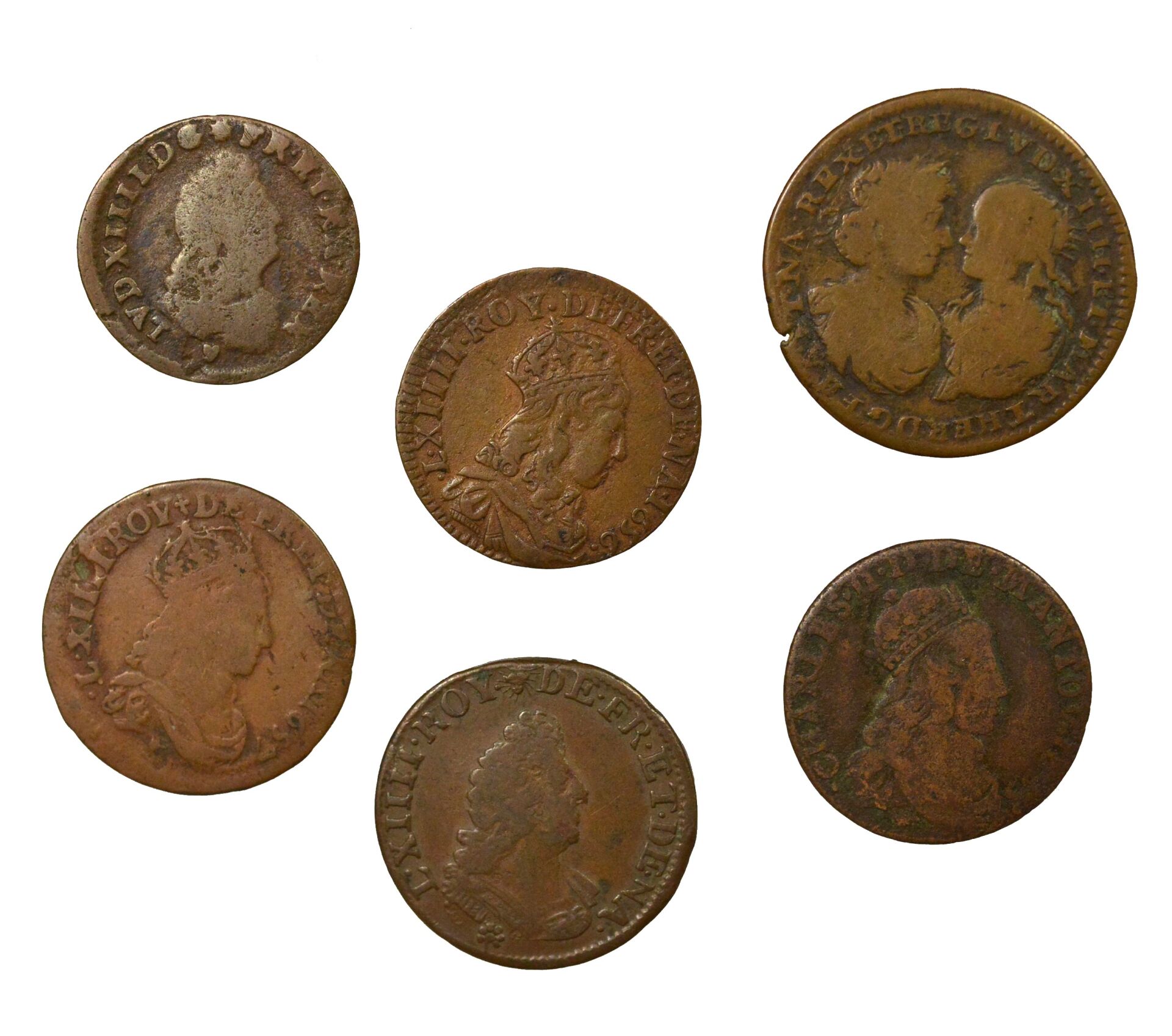 Ensemble de 4 monnaies de Louis XIV : - Liard de France, 1656 Paris, TTB - Liard de France, 1657 Lyon, TB/TB+ - II Deniers, 1708 Strasbourg, B+/TB - III Deniers, 1698 Strasbourg, TB+/TTB On y adjoint un Liard de Charles II de Gonzagues-Nevers, duc de Mantoue et un jeton du mariage avec Marie-Thérèse d'Autriche de 1660