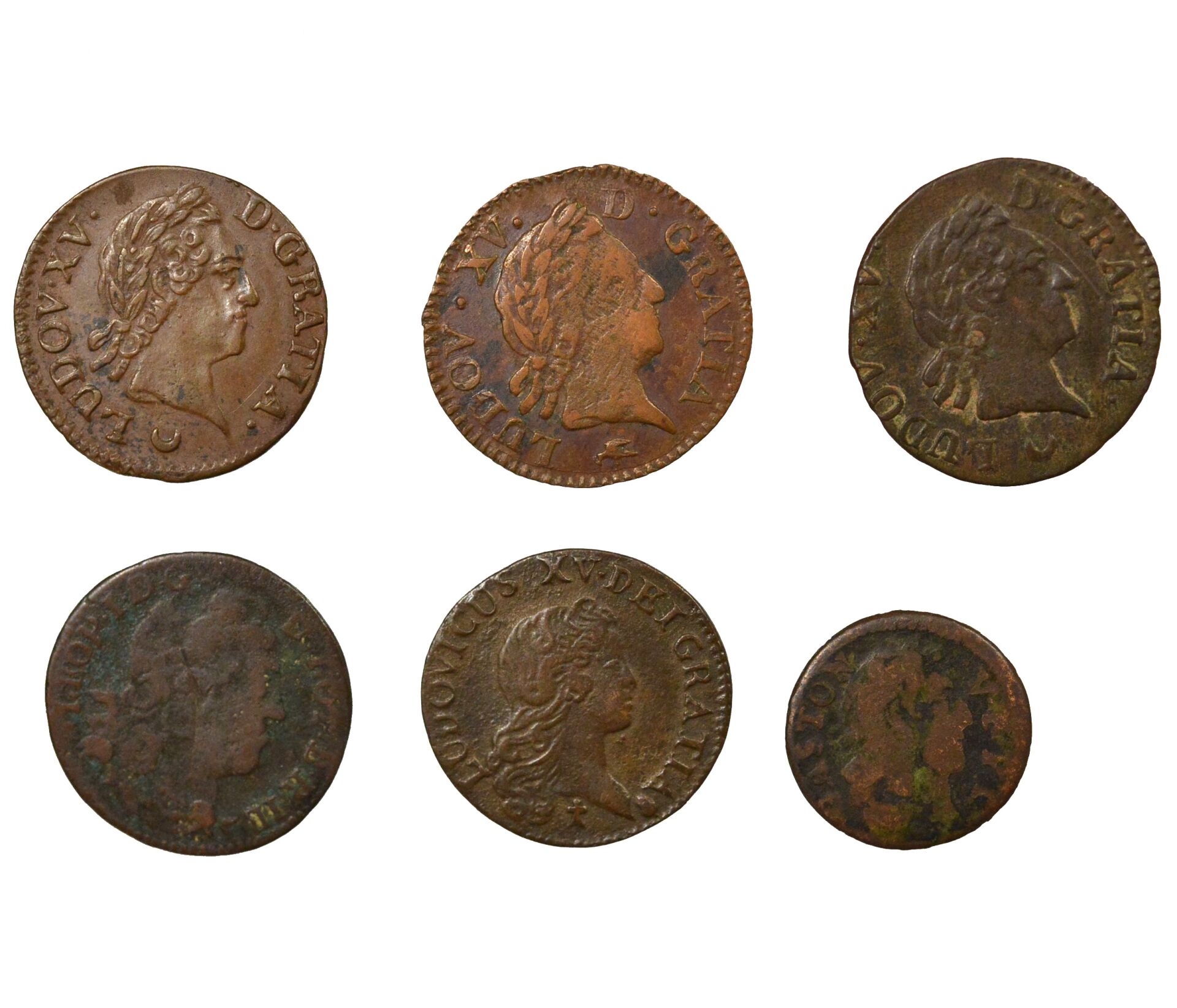 Ensemble de 4 monnaies de Louis XV : - Liard au buste enfantin, 1721 Reims, TB+/TTB - Liard à la vieille tête, 1771 Lyon, TB/TB+ - Liard à la vieille tête, 1772 Metz, TTB+/SUP (bel exemplaire) - Liard à la vieille tête, 1774 Metz, TTB/TTB+ On y adjoint un Liard de Lorraine, Léopold Ier, 1727 et un Denier tournois, Louis XV, 1651 Paris