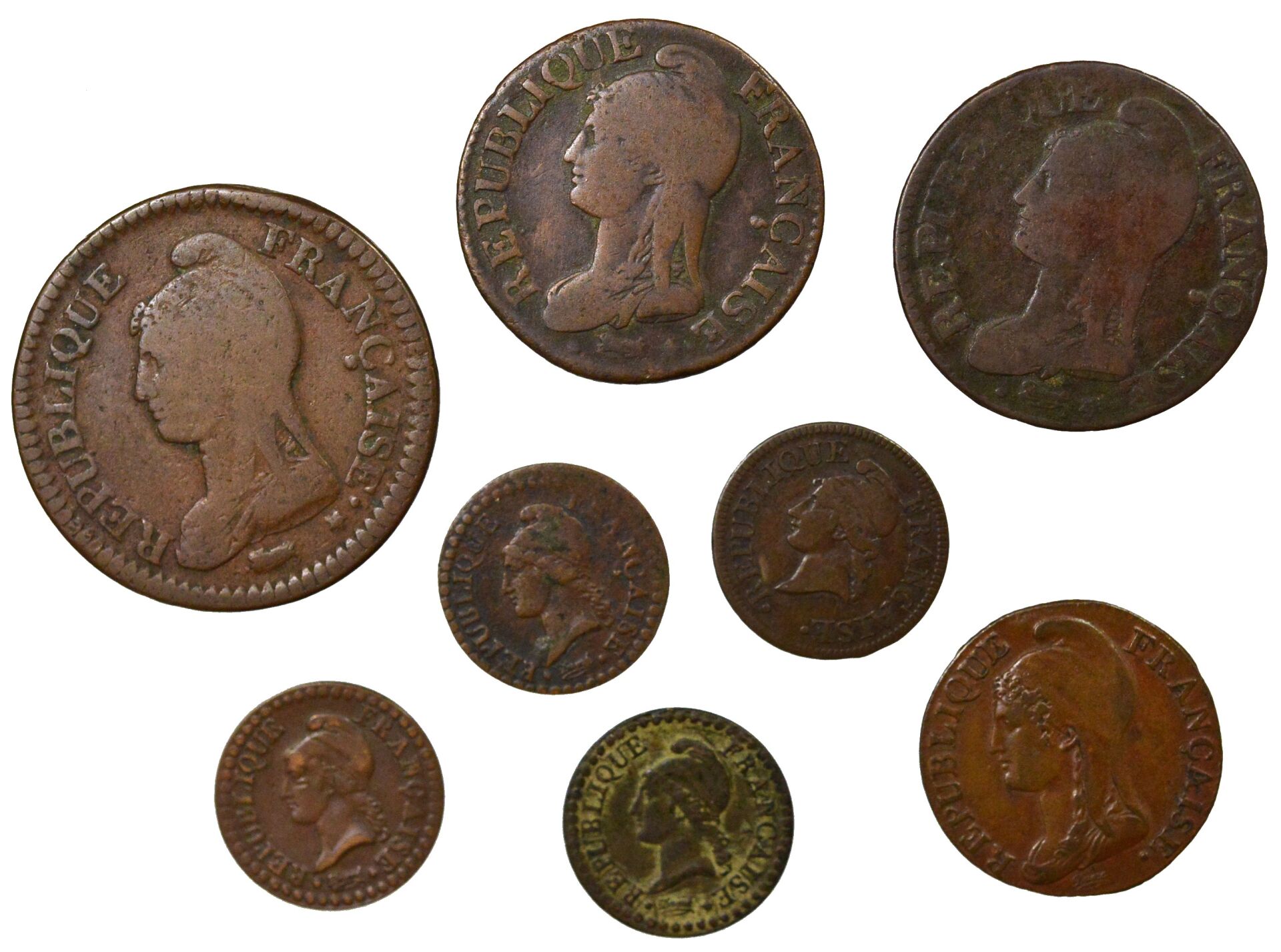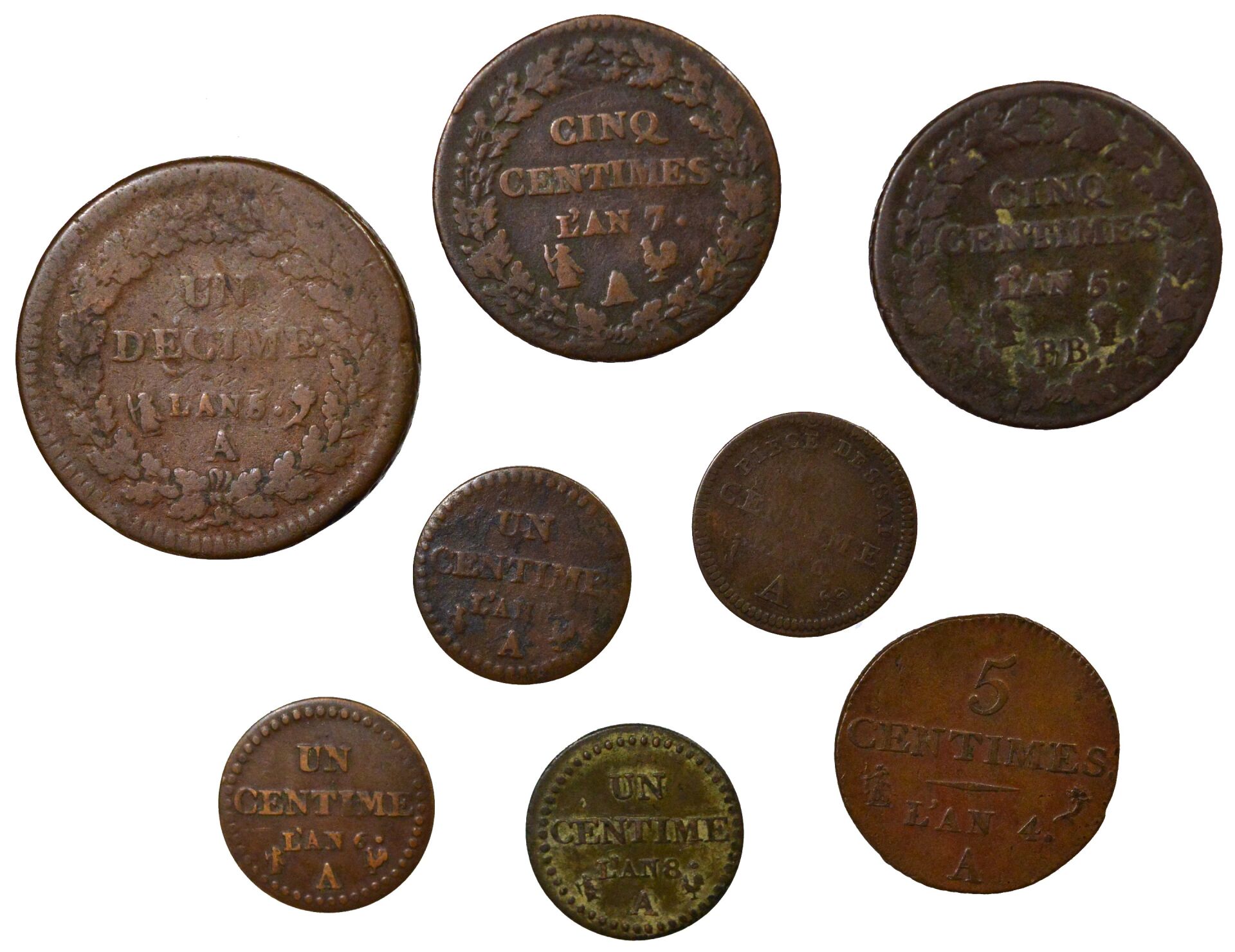 Ensemble de 8 monnaies du Directoire : - 1 Essai d'un Centime Dupré, An 6 Paris, TB - 3 pièces d'un Centime Dupré, An 6., An 7., An 8. Paris, TB à TTB+ - 1 pièce de 5 Centimes Dupré, petit module, An 4. Paris, TTB/TTB+ - 2 pièces de 5 Centimes Dupré, grand module, An 5. Strasbourg et An 7. Paris, TB à TTB - 1 pièce de d'un Décime Dupré, An 5. Paris, B+/TB