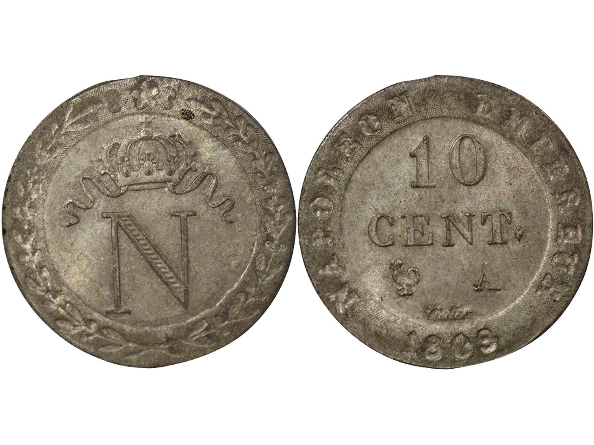 1 pièce de 10 Cent. à l'N couronnée, Napoléon Ier, 1808 Paris, SUP+ (très bel exemplaire avec argenture)