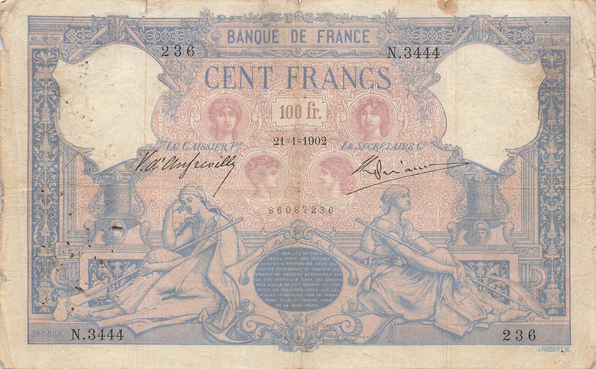 Billet de 100 francs Bleu et Rose. 21/01/1902. Série N.3444. Fayette 21.16. PTB