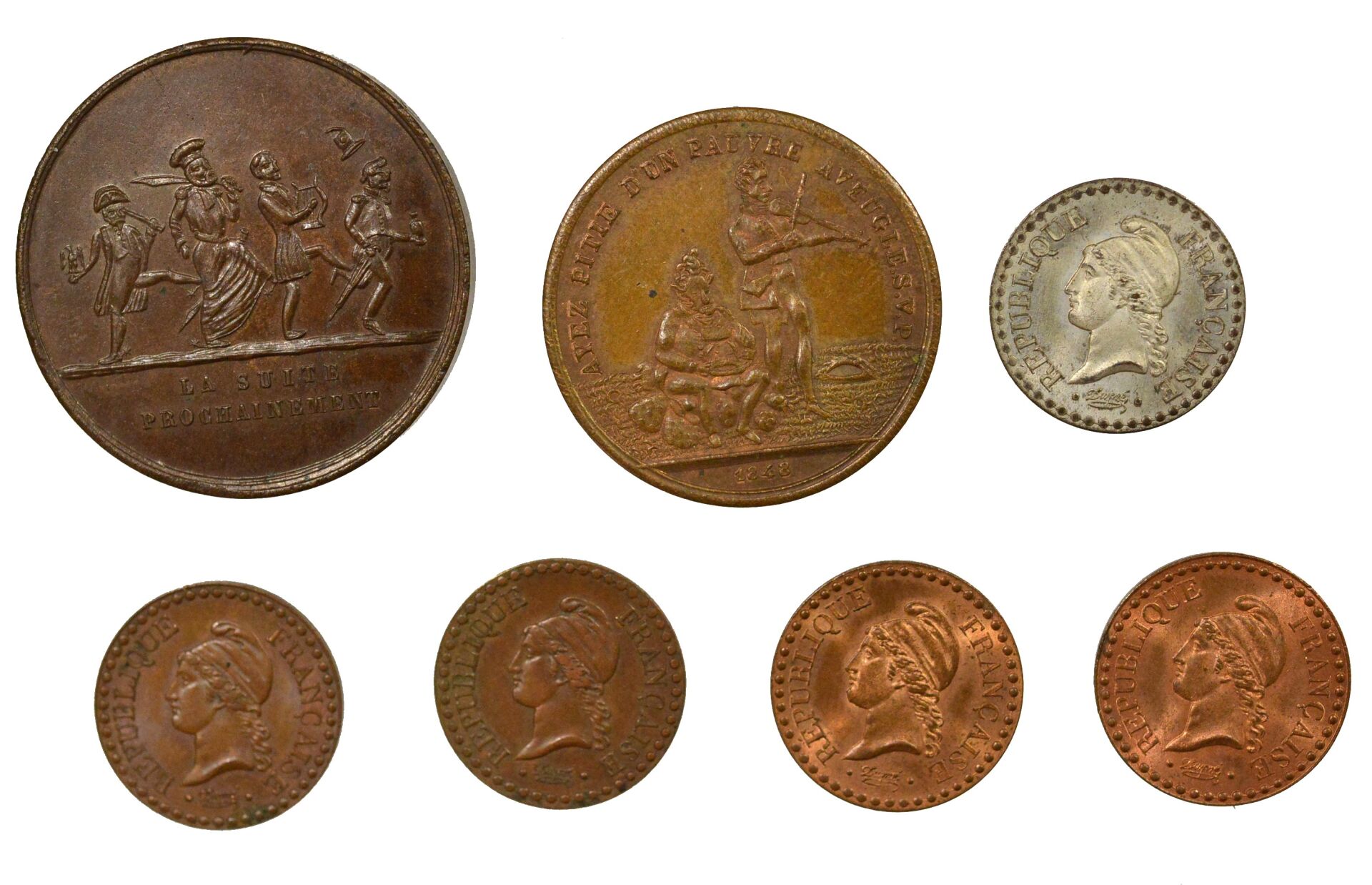 5 pièces de 1 Centime Dupré, IIe République : 1848 Paris (SPL), 1849 Paris (TTB), 1849 Paris (SPL), 1850 Paris (TTB), 1849 Paris (SPL : bel exemplaire nickelé) On y adjoint 2 médailles satiriques de 1848 raillant la chute de la Monarchie