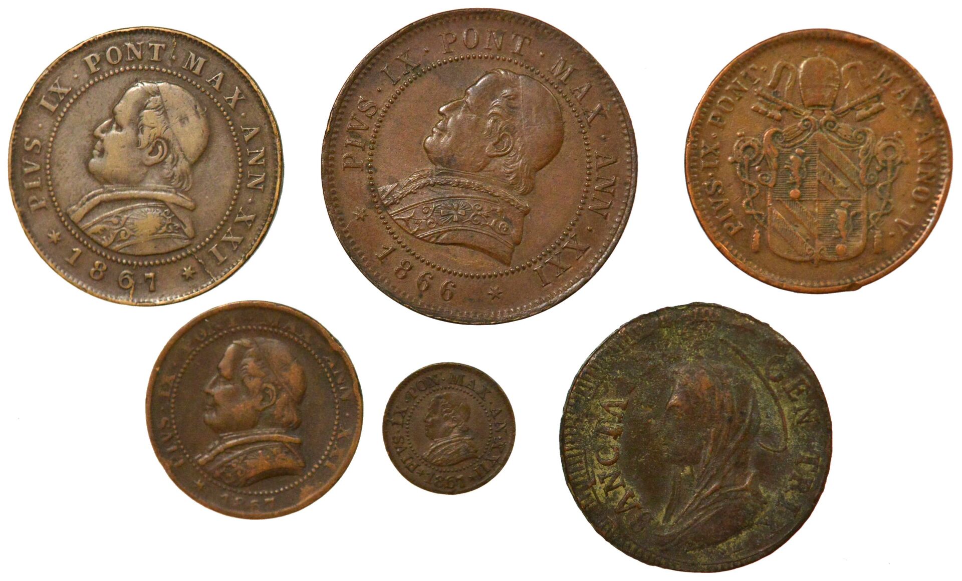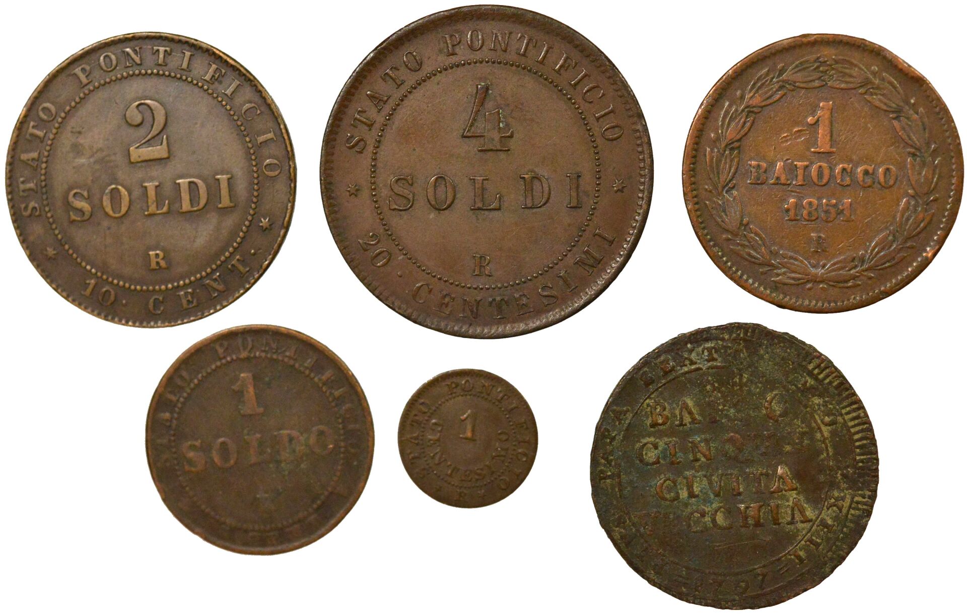Ensemble de 6 monnaies des Etats Pontificaux (Vatican) : - 1 pièce de 5 Baiocchi, 1797 Civitavecchia, TB - 1 pièce de 1 Centesimo, Pie IX, 1867 Rome, TTB/TTB+ - 1 pièce de 1 Soldo, Pie IX, 1867 Rome, TB - 1 pièce de 2 Soldi, Pie IX, 1867 Rome, TB+/TTB - 1 pièce de 4 Soldi / 20 Centesimi, Pie IX, 1866 Rome, TTB/TTB+ - 1 pièce de 1 Baiocco, Pie IX, 1851 Rome, TB+