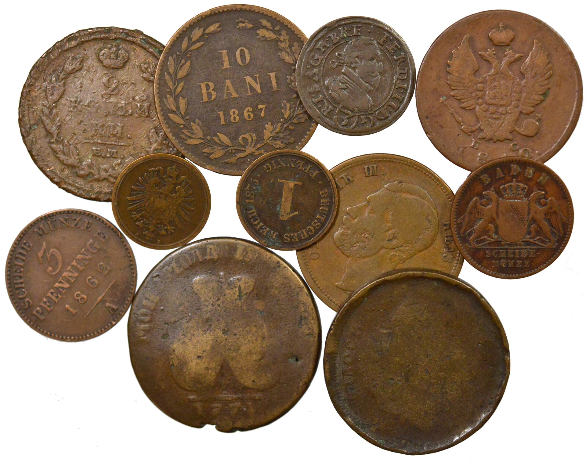 Ensemble de 7 monnaies de Russie et d'Europe de l'Est : - 2 pièces de 2 Para / 3 Kopecks, Moldavie et Valaquie, 1774, AB à B - 2 pièces de 2 kopecks, Russie, Alexandre Ier, 1811 Ekaterinbourg et 1812 Saint-Petersbourg, B+ à TB+ - 1 pièce de 10 Para, Serbie, Michel III Obrenovich, 1868, TB - 1 pièce de 10 Bani, Roumanie, Carol Ier, 1867 TB - 1 pièce de 3 Kreuzer, Silésie, Ferdinand II, 1626 TB/TB+ On y adjoint 4 monnaies divisionnaires allemandes (1 Pfennig, 3 Pfenninge Prusse, 1 Kreuzer Baden)