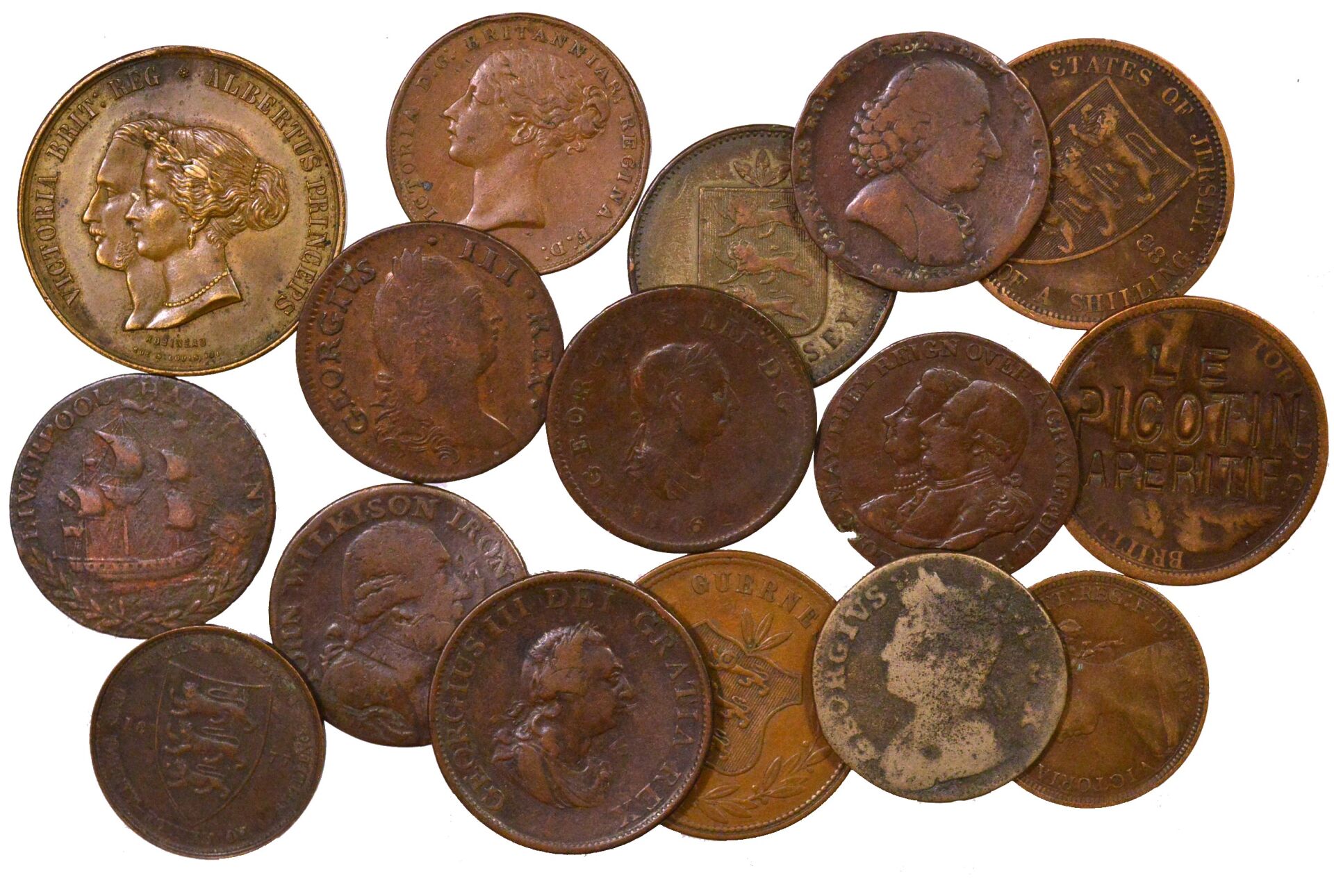 Ensemble de 15 monnaies et jetons des Îles Britanniques : - 1 pièce de 8 Doubles, Guernesey, 1864, TB+/TTB - 1 pièce de 4 Doubles, Guernesey, 1830, TB - 1 pièce d'1/24e de Shilling, Jersey, Victoria, 1877, TB+ - 1 pièce d'1/26e de Shilling, Jersey, Victoria, 1844, TB+ - 1 pièce d'1/12e de Shilling, Jersey, Victoria, 1888, TB+ - 1 pièce d'1/2 Penny, Grande-Bretagne, Victoria, 1887, TB+ - 1 pièce d'1/2 Penny, Grande-Bretagne, George III, 1806, B+/TB - 2 pièces d'1/2 Penny, Grande-Bretagne, George III, 1799 et 1806, B+ à TB+ - 1 pièce d'1/2 Penny, Grande-Bretagne, George II, date illisible, AB/B - 1 pièce d'1/2 Penny, Irlande, George III, 1781, TB/TB+ - 1 jeton d'1/2 Penny, Charles Roe, N/D, B/B+ - 1 jeton d'1/2 Penny, Liverpool, 1794, TB - 1 jeton d'1/2 Penny, John Wilkinson, 1787 B/TB - 1 jeton d'1/2 Penny, Middlesex, Provincial coins, N/D, TB On y adjoint une médaille pour la visite française de Victoria et Albert en 1855 et un Penny de 1874 marqué en jeton publicitaire "Le Picotin Apéritif"