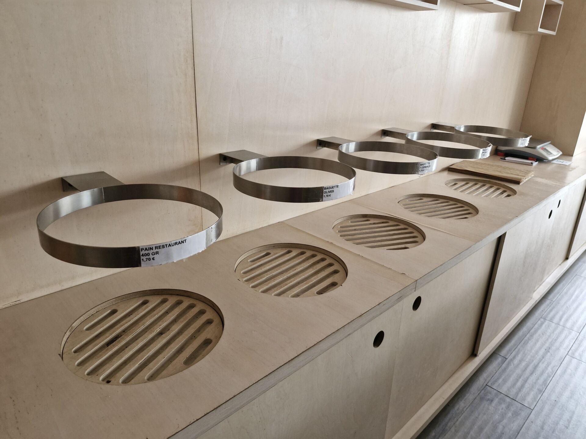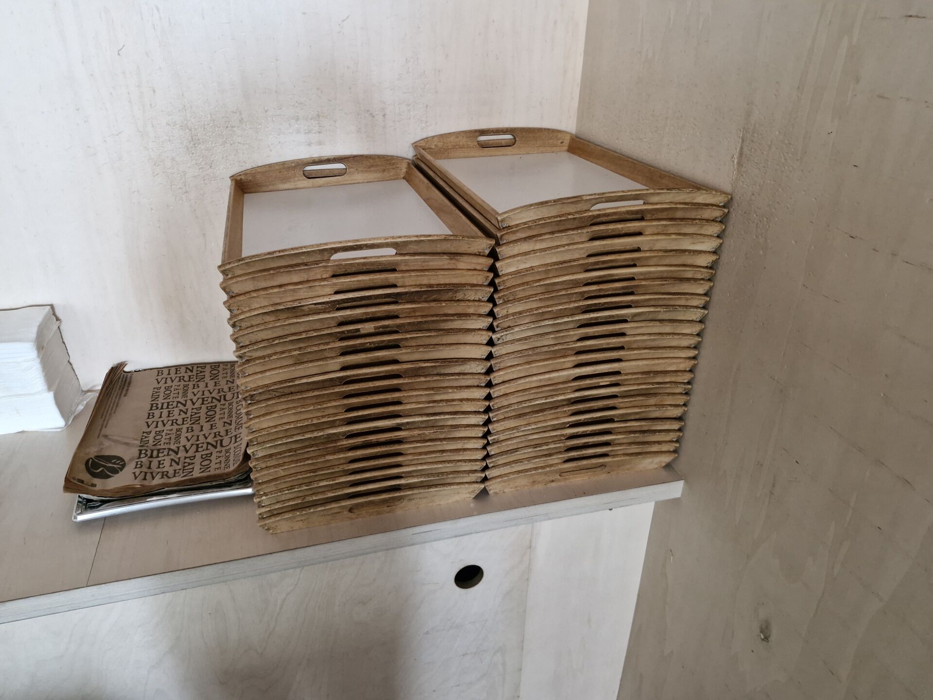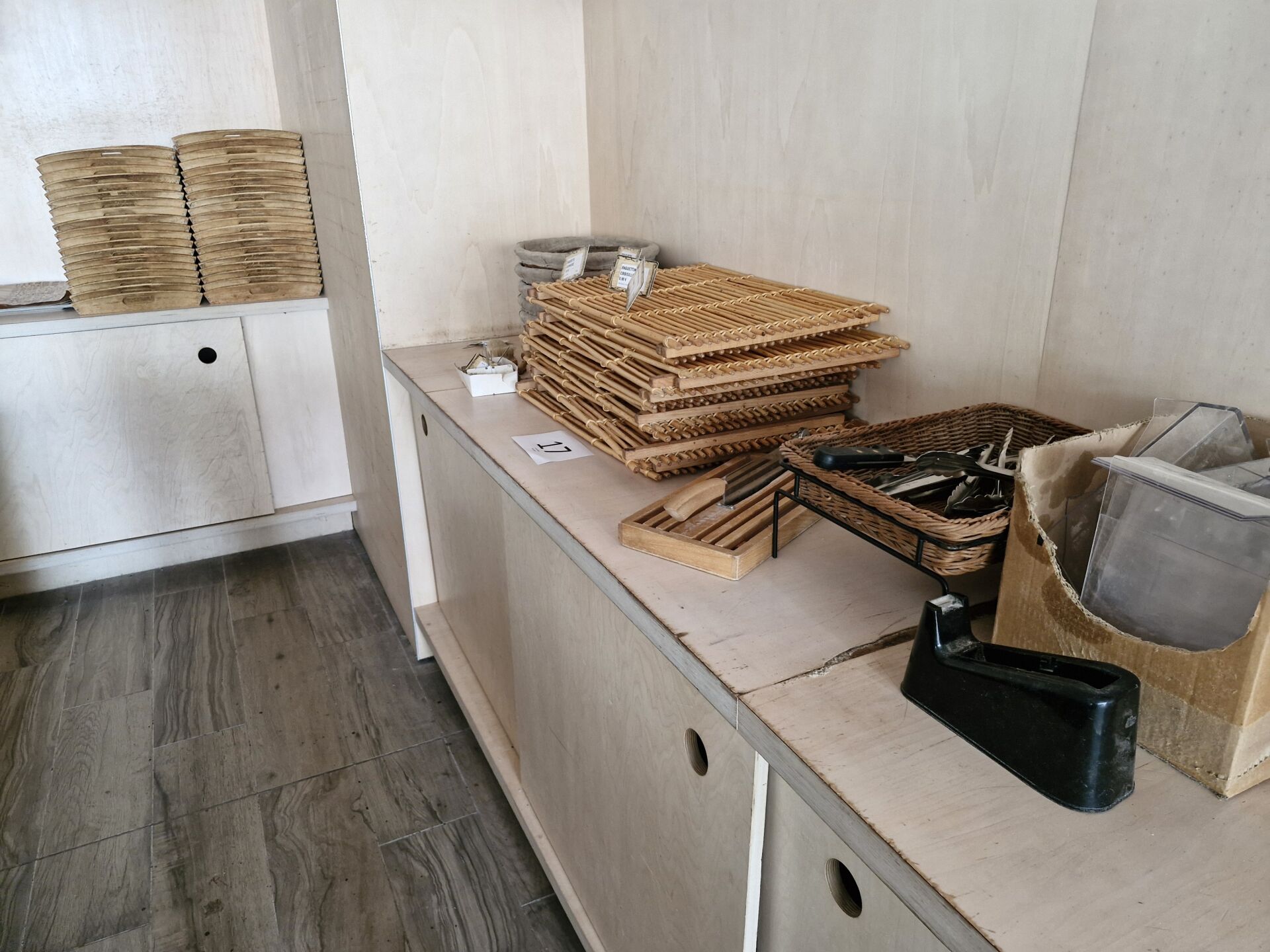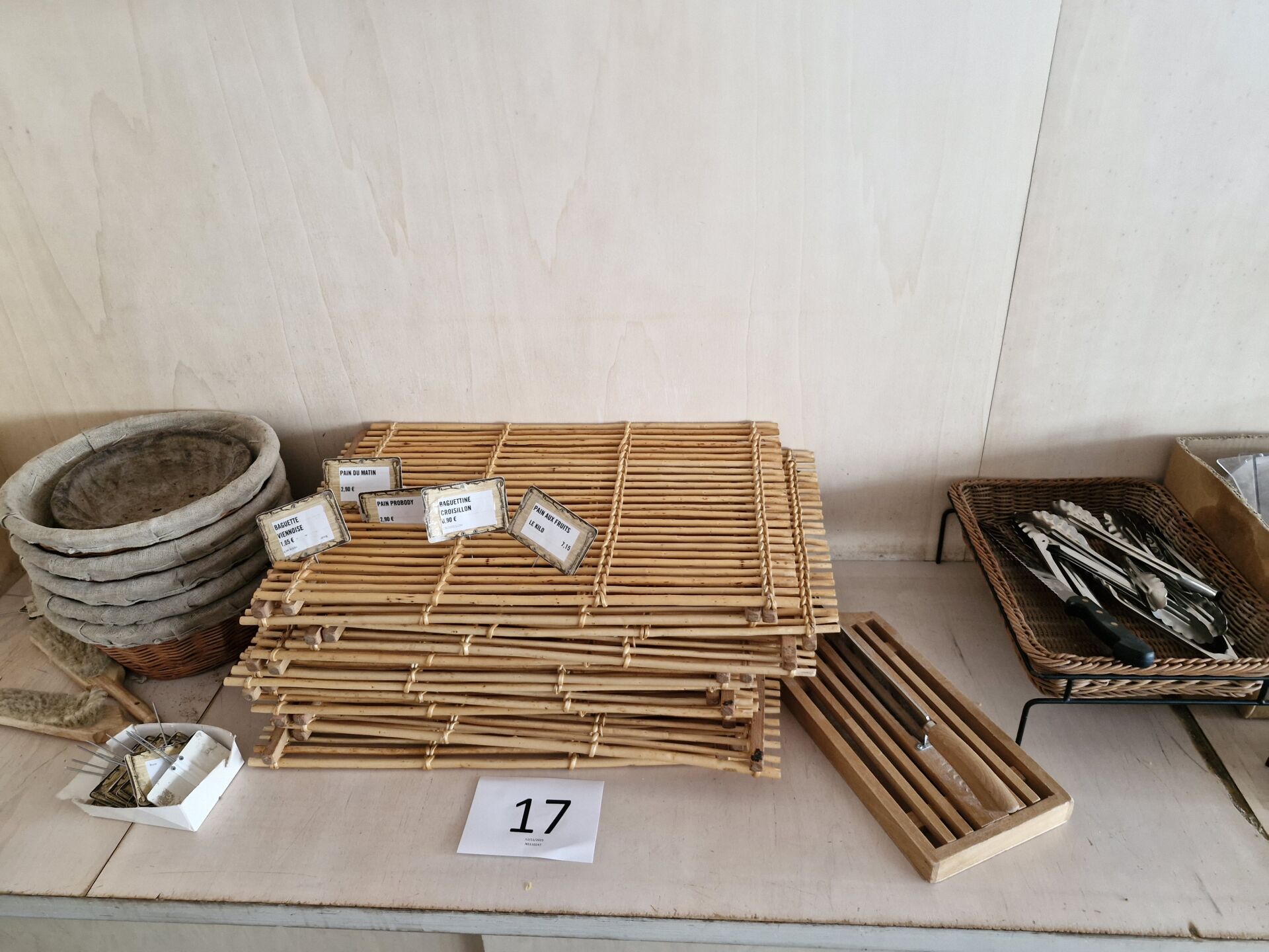 1 lot de 40 plateaux bois 56 x 37 cm, 12 paillasses en bambou 60 x 40 cm, 5 paniers en osier, 7 pinces inox, 1 trancheuse à pain manuelle, petites étiquettes de prix, 5 cercles inox muraux diam 35 cm, consommables dont sacs à pain craft, couverts bois etc