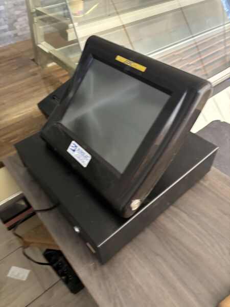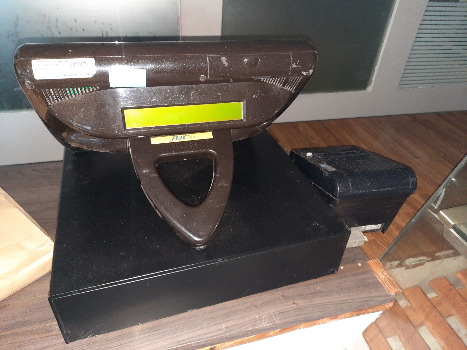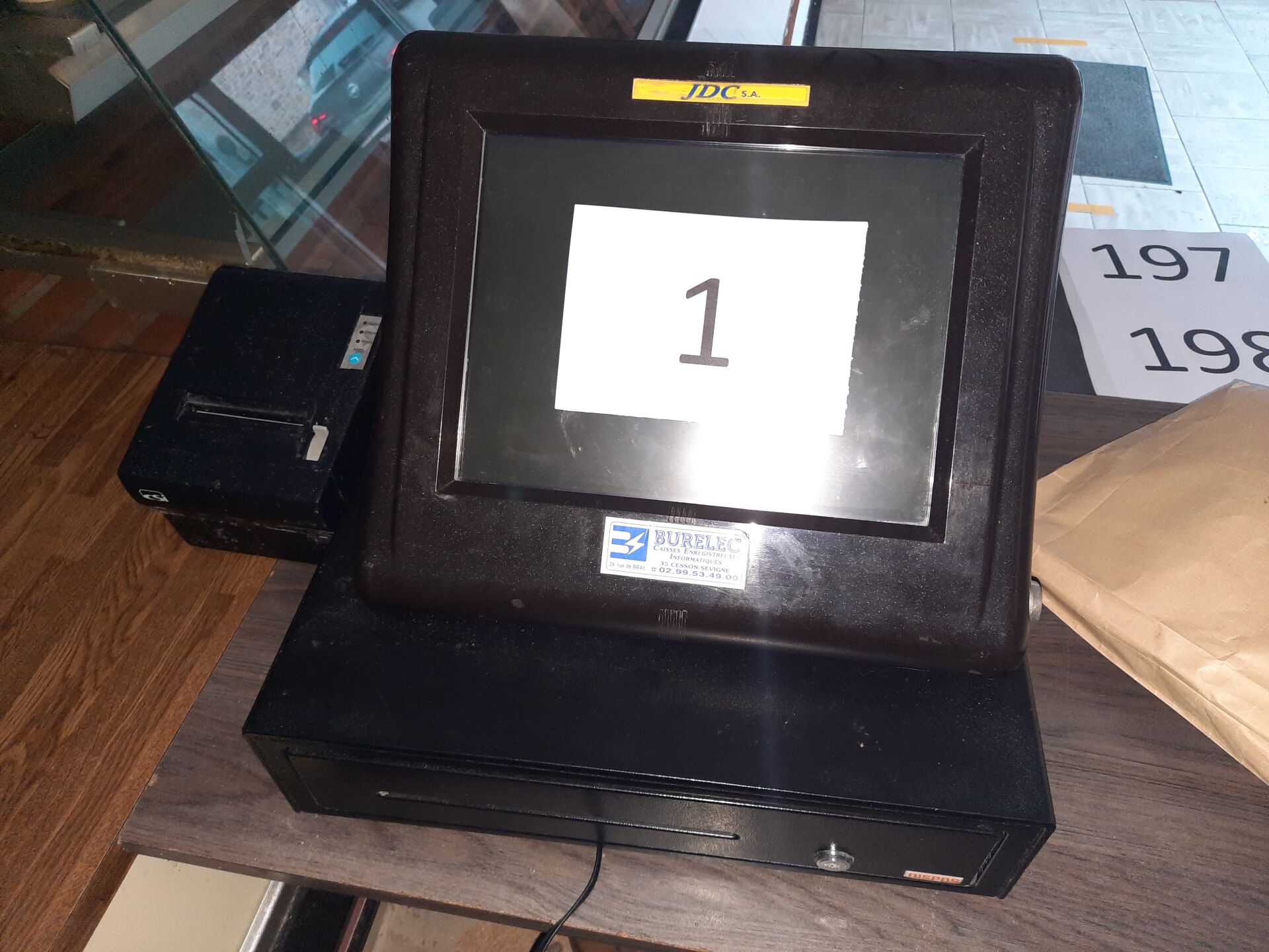 Caisse enregistreuse, sans marque ni modèle apparents, à écran tactile, avec imprimante à tickets CSI, tiroir-caisse