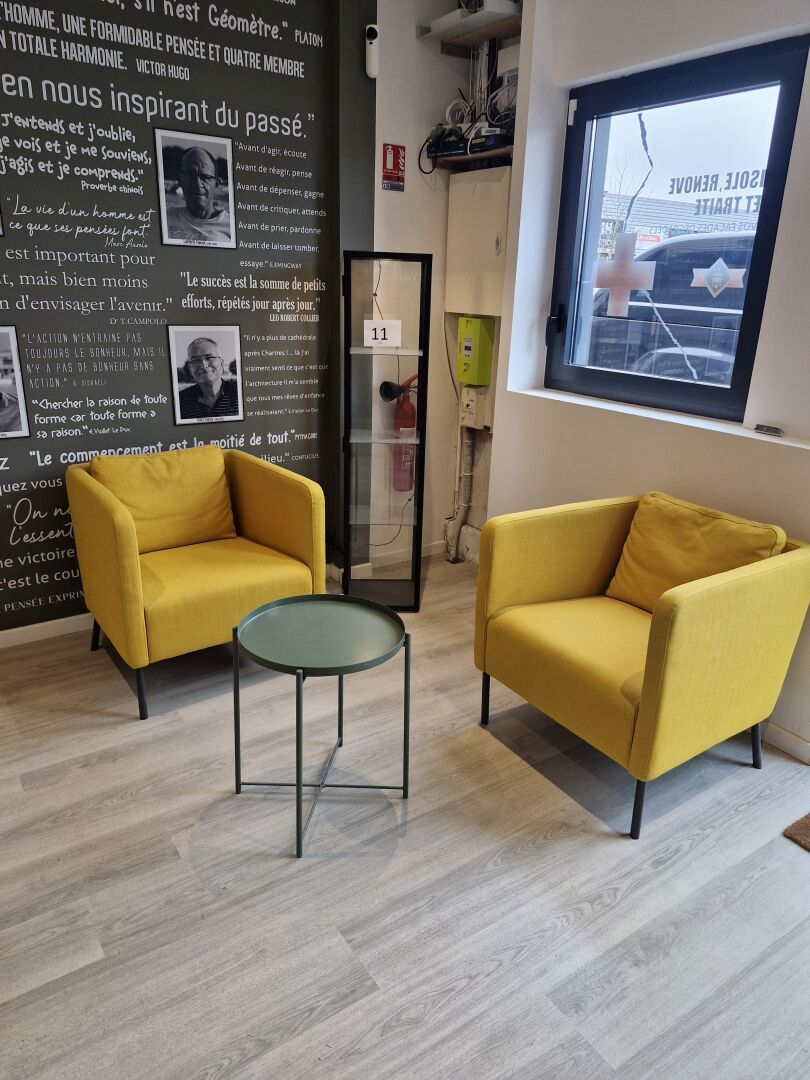 2 fauteuils tissu jaune 1 vitrine colonne métal noir avec éclairage 34 x 34 x 152 cm 1 table basse métal vert diam 44 cm 1 téléviseur EDENWOOD ED32 A11HD-GM avec carton