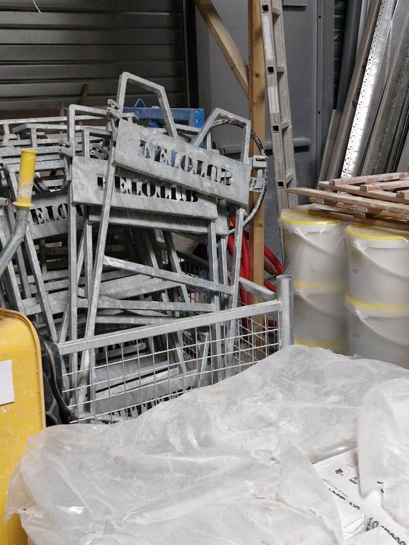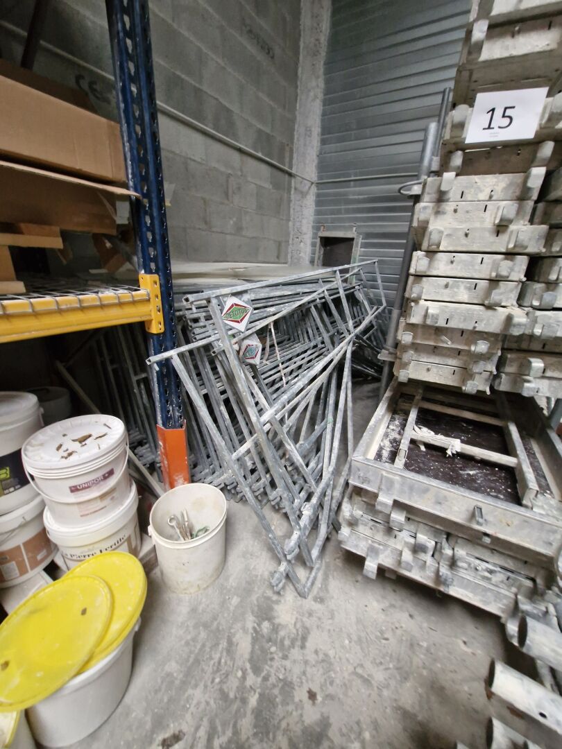1 lot d'éléments d'échafaudage galva comprenant : - plateaux dont à trappe 295 x 60 cm (x6) et demi-plateaux 295 x 30 cm (x35) RETOTUB - barres de fixation - garde corps - structure parapluie