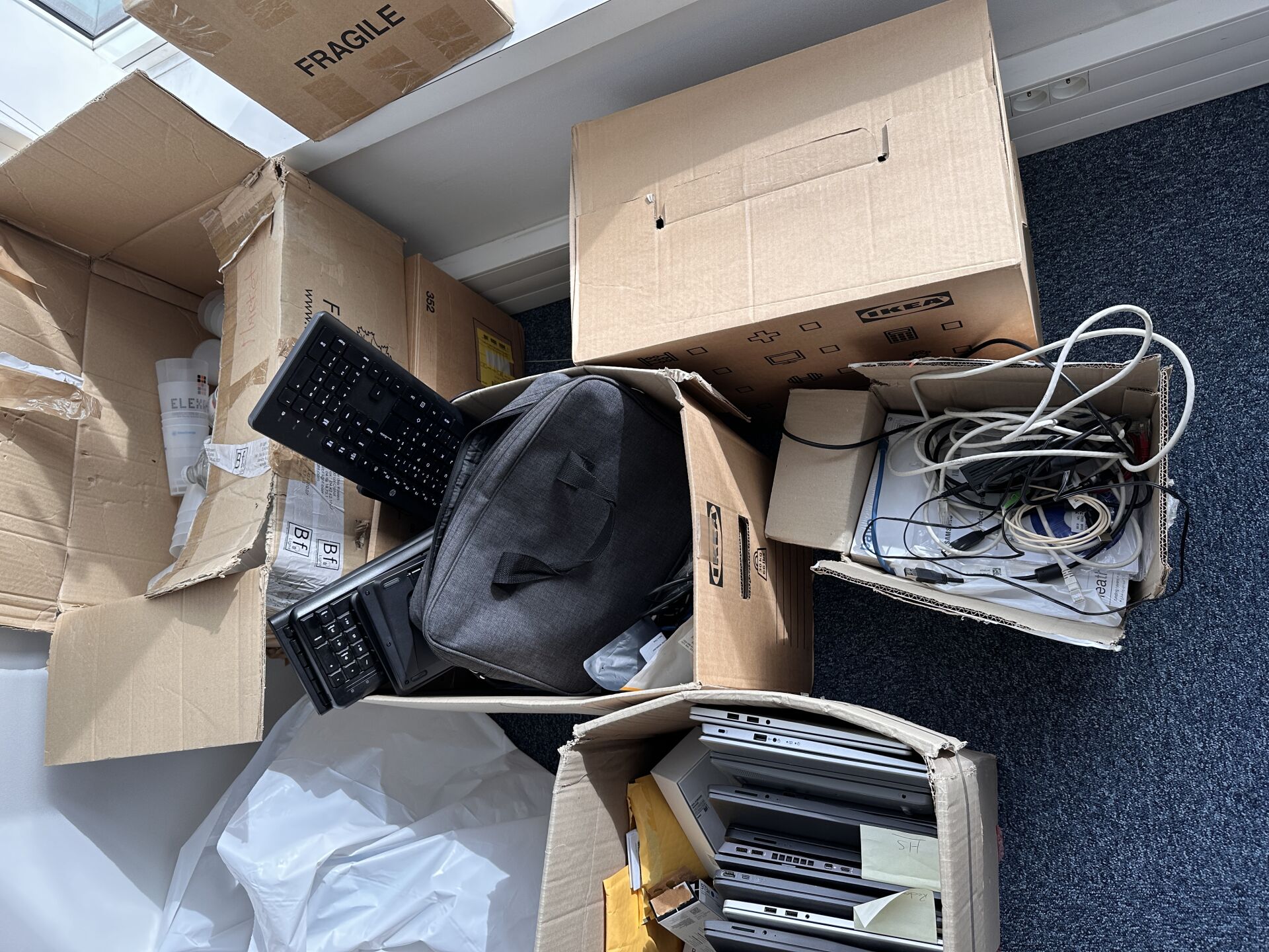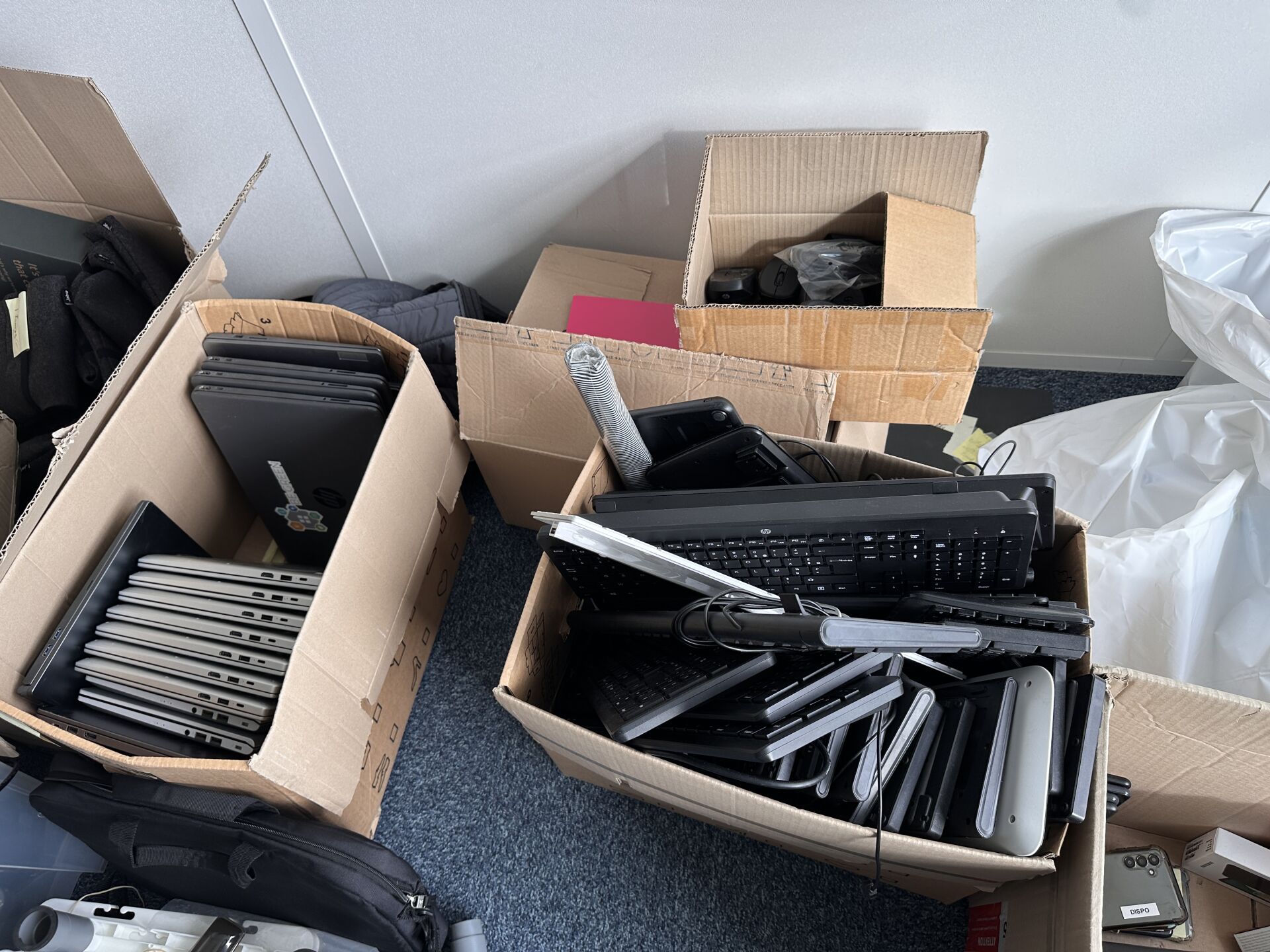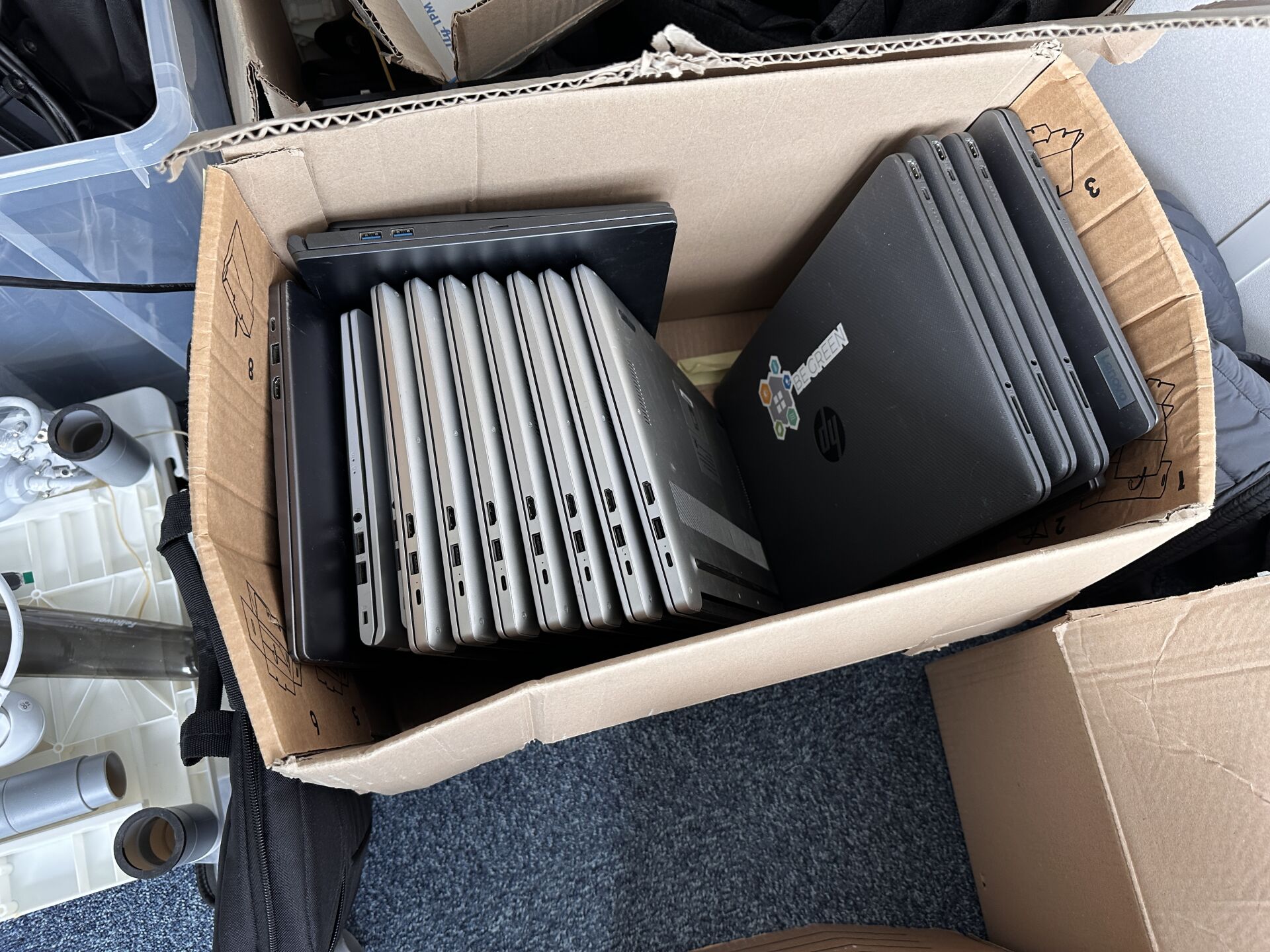 Lot de matériel informatique non utilisé comprenant : 29 ordinateurs portables anciens modèles, dont 3 HS Lot de téléphones portables bloqués, essentiellement SAMSUNG Claviers, souris, 2 cloisons 2 écrans incurvés SAMSUNG 24" 4 écrans 24" (HUAWEI, SAMSUNG)