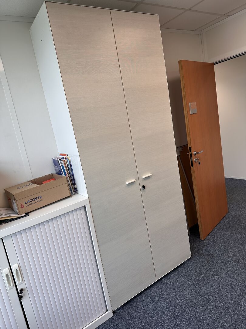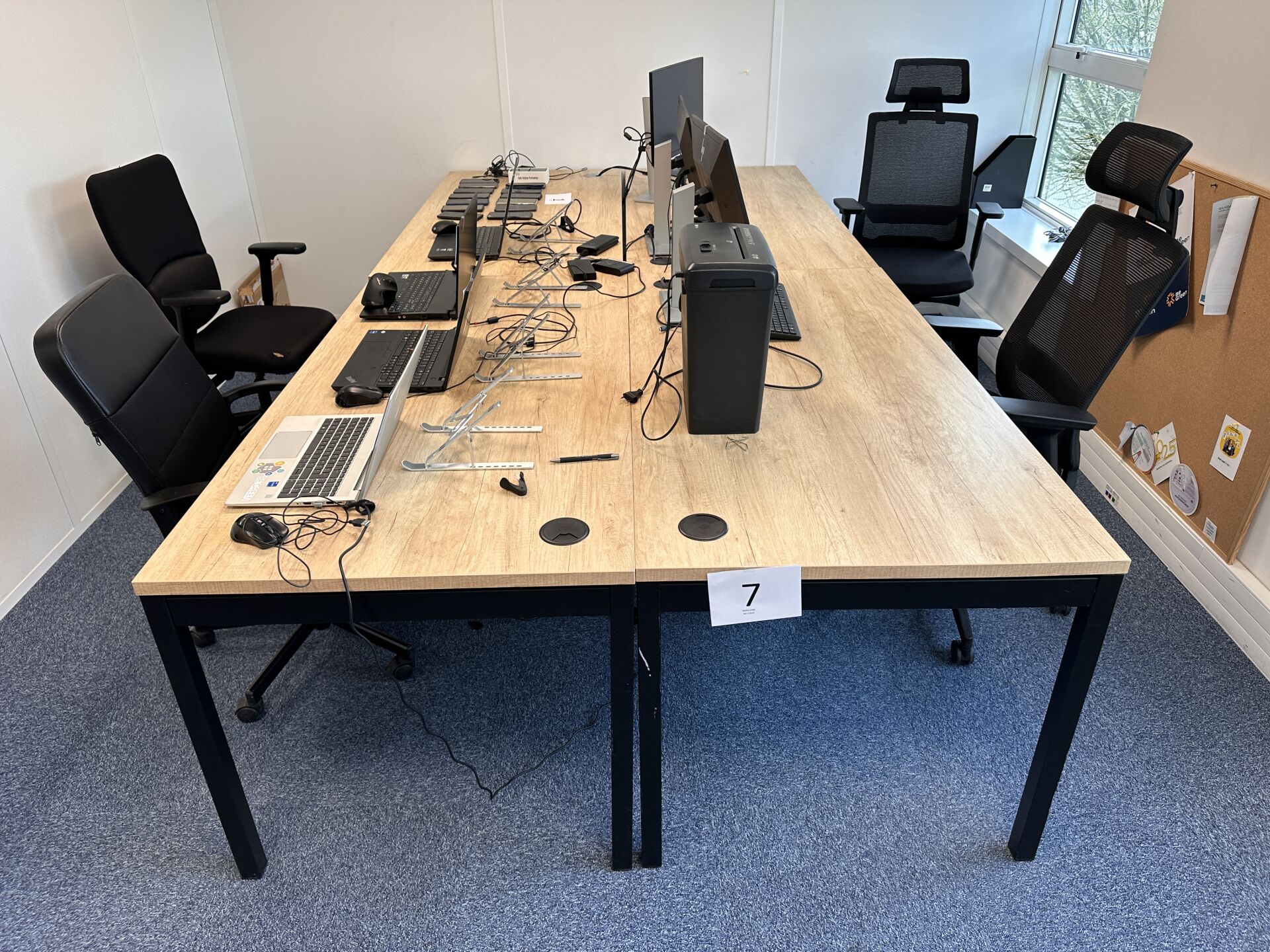 4 tables piètement métal noir, plateau en mélaminé bois, l'un assis-debout électrique (160 x 80 cm) 4 fauteuils dactylo différents modèles Porte-manteau en métal blanc Meuble métallique blanc à rideaux (120 x 45 x 105 cm) Armoire en métal et mélaminé blanc à 2 portes (100 x 45 x 238 cm) avec petites fournitures de bureau 2 caissons mobiles en métal blanc 2 tiroirs 1 paper board