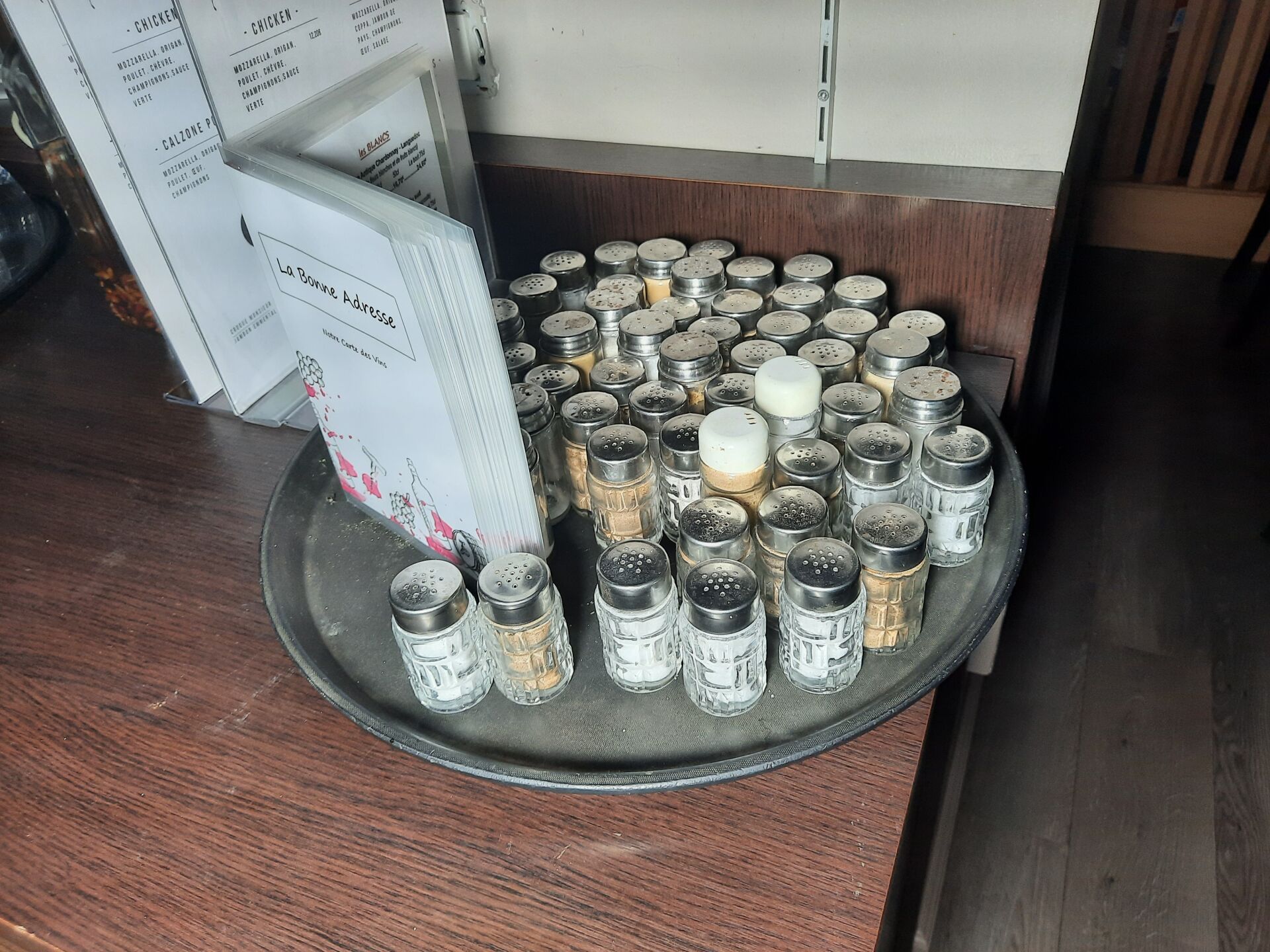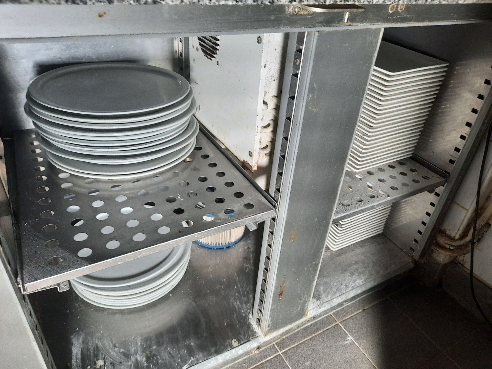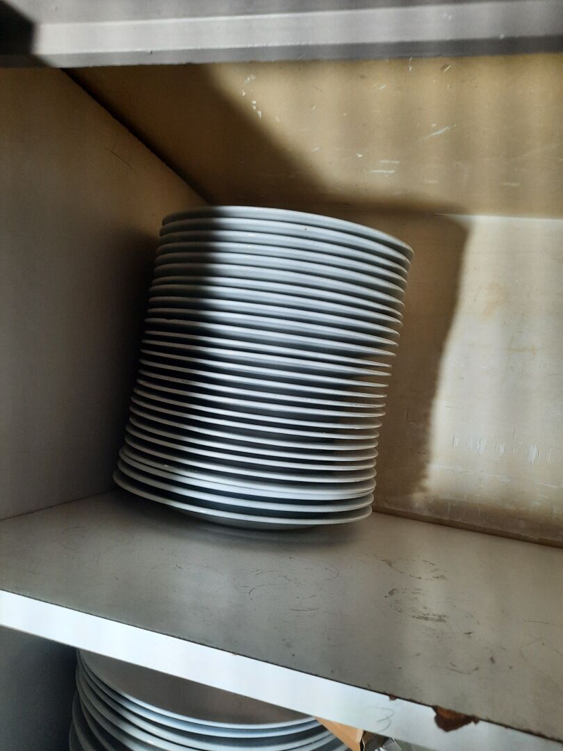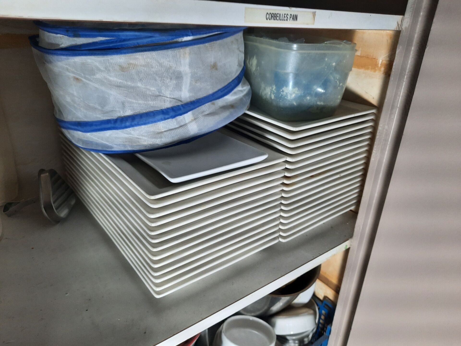 Réparti dans le local : Ensemble d'assiettes blanches carrées, rectangulaires, circulaires Ensemble de couverts, panières, salières, huiliers